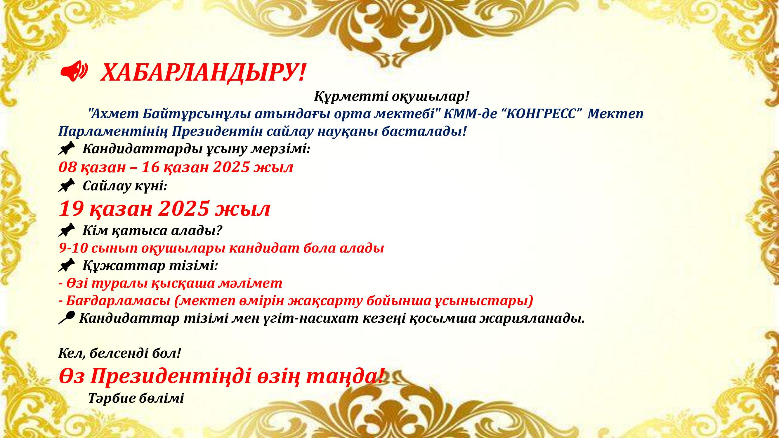 "Ахмет Байтұрсынұлы атындағы орта мектебі" КММ-де “КОНГРЕСС” Мектеп Парламентінің The presidentін сайлау науқаны басталады!