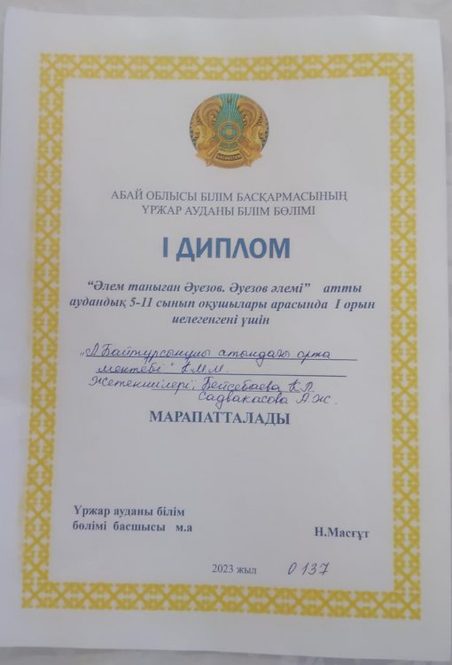 "Әлем таныған Әуезов. Әуезов әлемі" атты аудандық 5-11 сынып оқушылары арасында Үржар аудандық білім бөлімі басшысының І дәрежелі дипломымен марапатталды. Жетекшілер: Бейсебаева Карлыга Абдигалиевна және Садвакасова Алмагуль Жубангалиевна
