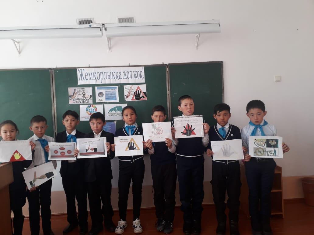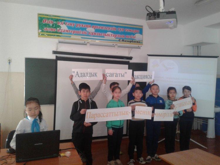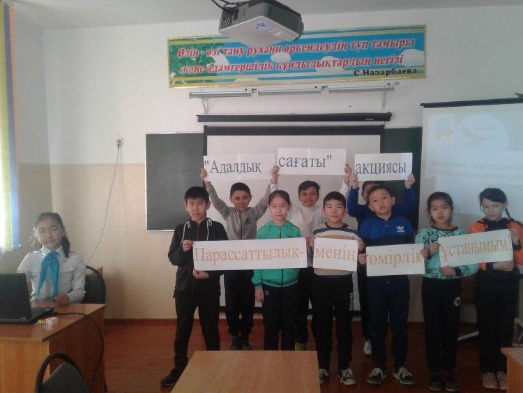 1 «А» сынып сынып жетекшісі Ноғаева Лаззат Макашевна «Жақсылық жасау -өзіңнен», 6 «Б» сыныбы сынып жетекшісі «Адалдақ сағаты», 5 «А» сыныбы жетекшісі Жаркынбаев Нуржан Бейсенбекович «Парасаттылық менің өмірлік ұстанымым», 9 «А» сыныбы жетекшісі Тусупбекова Гүлназ Төлеугазиевна «Жемқорлыққа жол жоқ» атты т.б тәрбие сағаттары өтті. Оқушылар парасаттылы, мейірімділік, жақсылық, шынайылық ұғымдары туралы толық мағұлматтар алды, сыбайлас жемқорлыққа қарсы ішкі сезімдері дамыды.