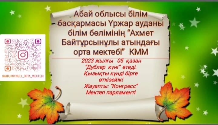 "Ахмет Байтұрсынұлы атындағы орта мектебі" КММ-де 2023 жылы қазан айының 5 жұлдызында Ұстаздар күніне орай "Дублер күні" өтеді. Жауапты: "Конгресс" Мектеп Парламенті