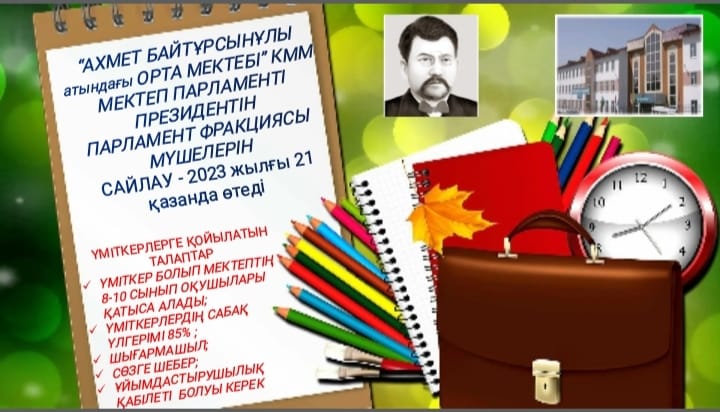 "Ахмет Байтұрсынұлы атындағы орта мектебі" КММ-де 2023 жылы қазан айының 21 жұлдызында Мектеп Парламенті The presidentін және Парламент фракциялары мүшелерін сайлау өтеді. Жауапты: Тәрбие ісі орынбасары-Жаркынбаев Нуржан Бейсенбекович: Тәлімгер - Ибраева Айгерим Саматовна