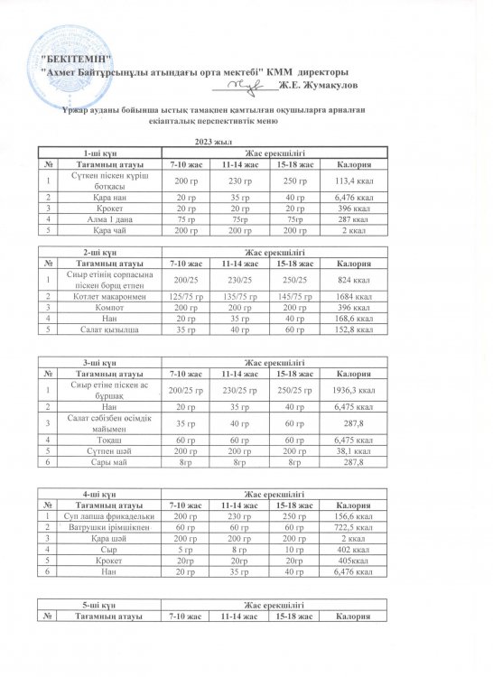04 September 2023 0 1 2 3 4 5 2023-2024 оқу жылы І- жарты жылдығына арналған ас мәзірі "Ахмет Байтұрсынұлы атындағы орта мектебі" КММ- сі 2023-2024 оқу жылы І жарты жылдығына арналған ас мәзірі: