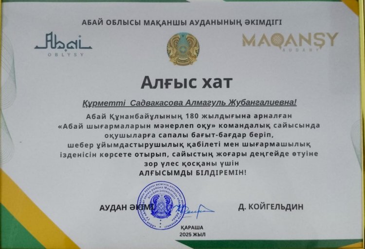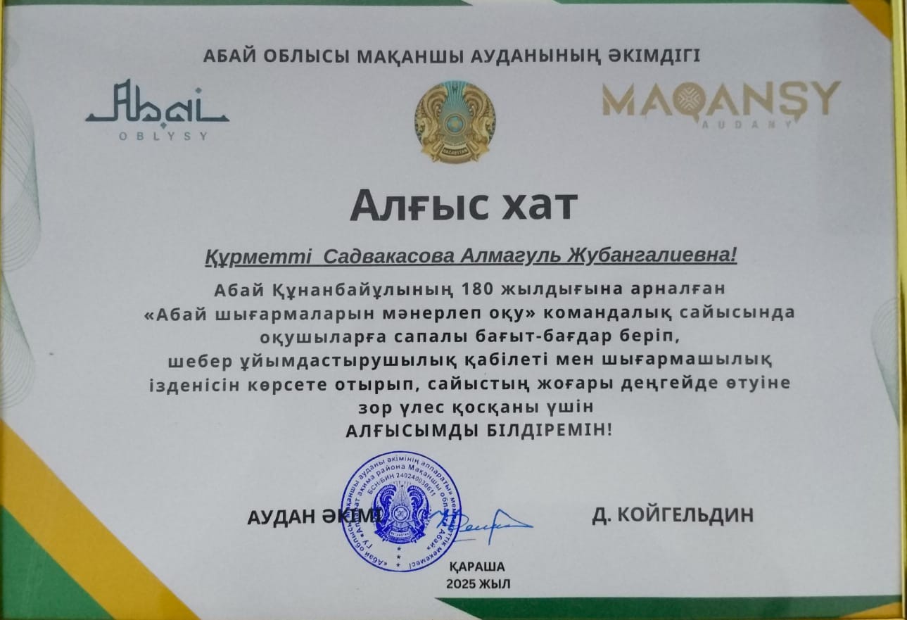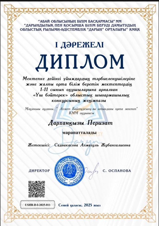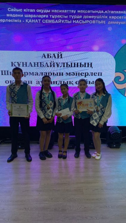 Мектепке дейінгі ұйымдардың тәрбиеленушілеріне және жалпы орта білім беретін мектептердің 1-11 сынып оқушыларына арналған "Үш бәйтерек" облыстық конкурсының жеңімпаздары 6 сынып оқушысы Дарханқызы Перизат(жетекшісі: Садвакасова А. Ж.) 1- орынмен, 8-сынып оқушысы Бейсенбек Нұрсара(жетекшісі: Хасенова Р. М.) 3-орынмен марапатталды.]]>
