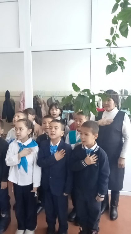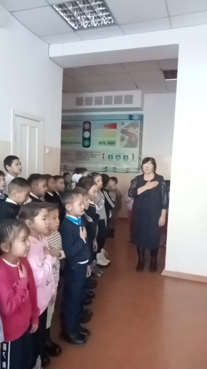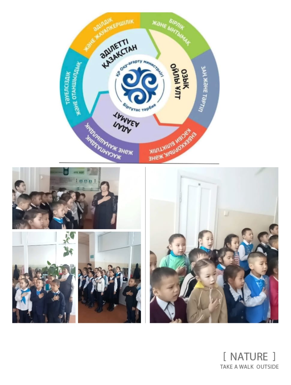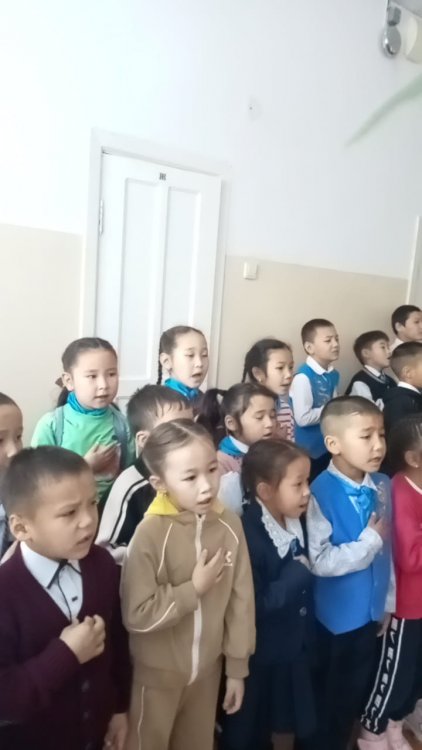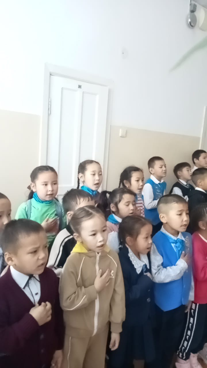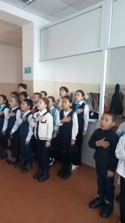 «Ахмет Байтұрсынұлы атындағы орта мектебі» КММ-нің мектеп оқушылары Жаңартылған "Біртұтас тәрбие " бағдарламасының кешенді жоспарына сәйкес оқу аптасының бірінші күні ҚР Әнұранын орындады