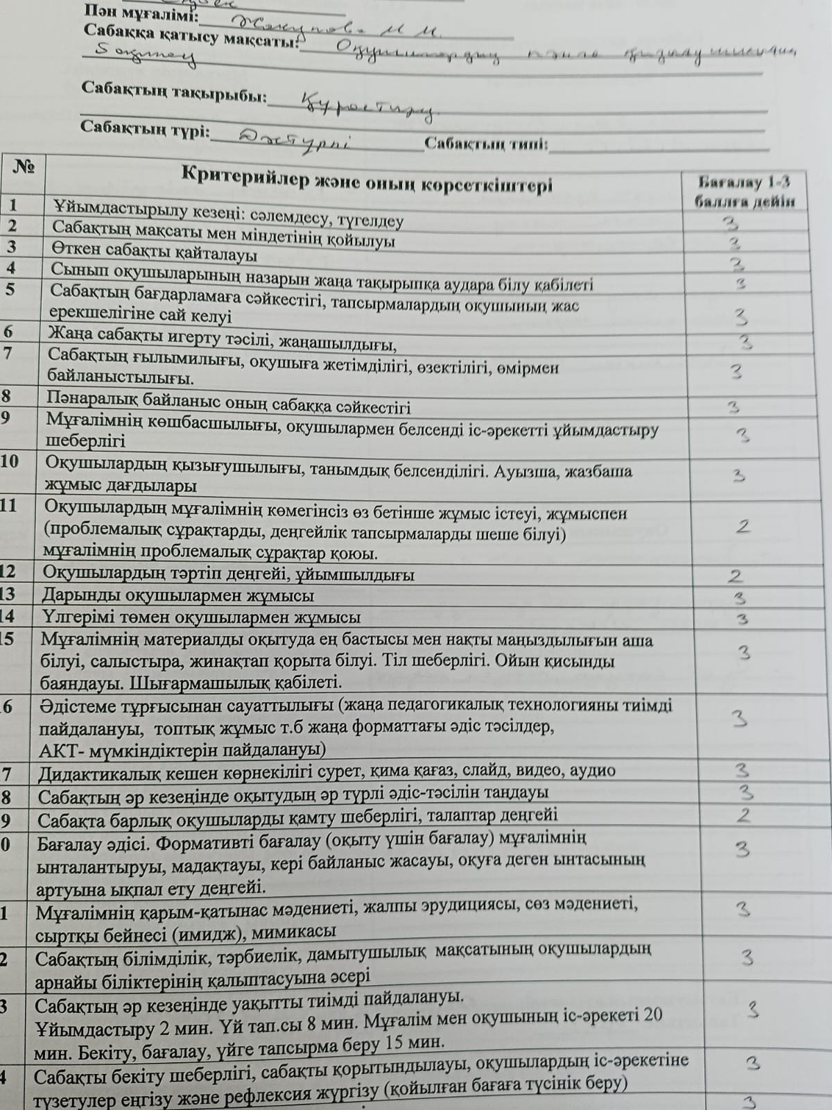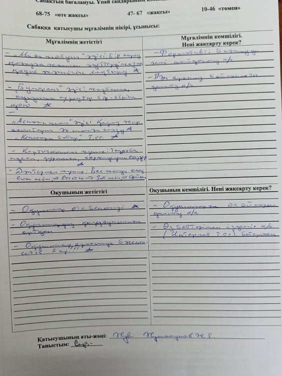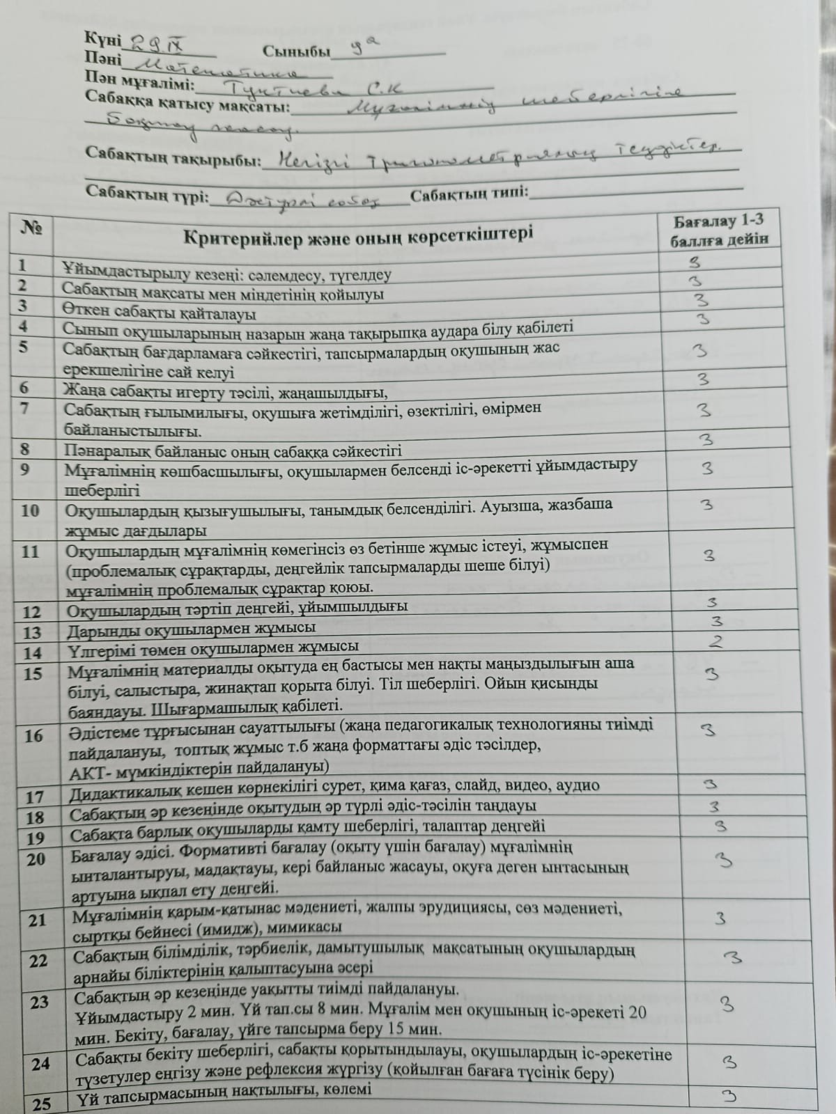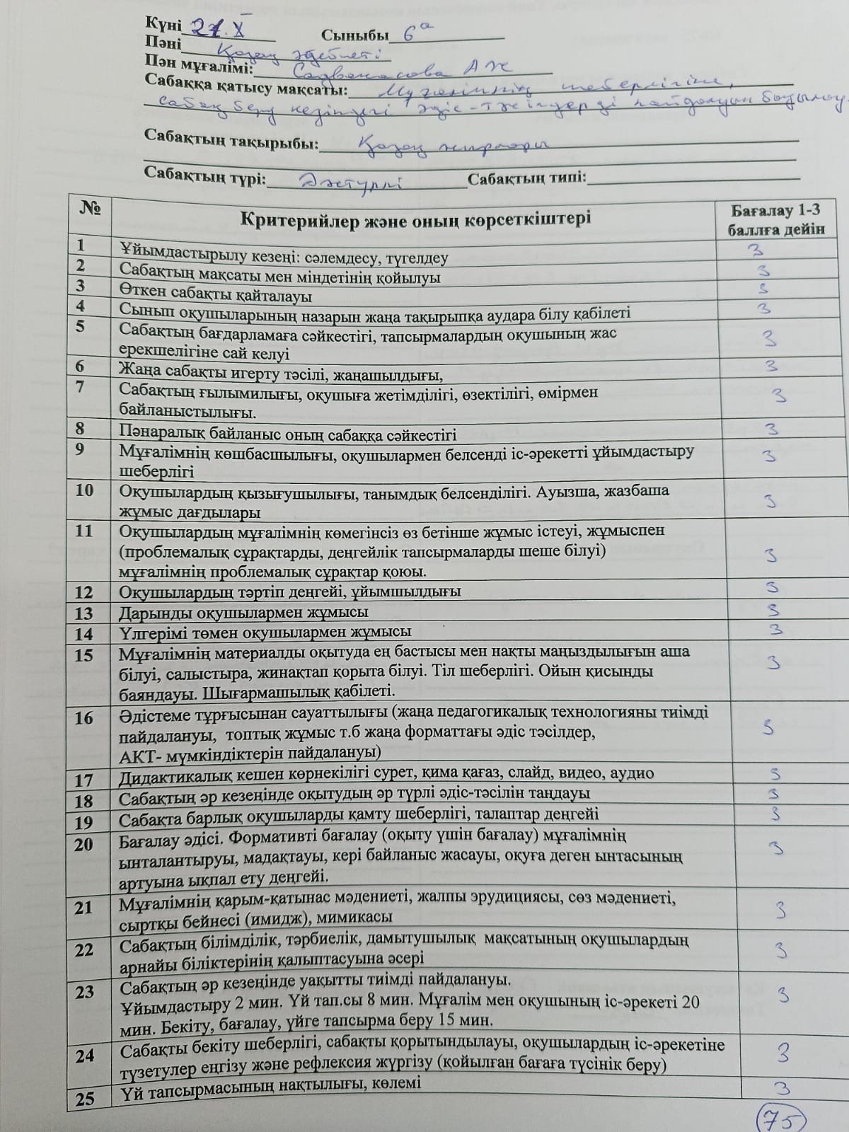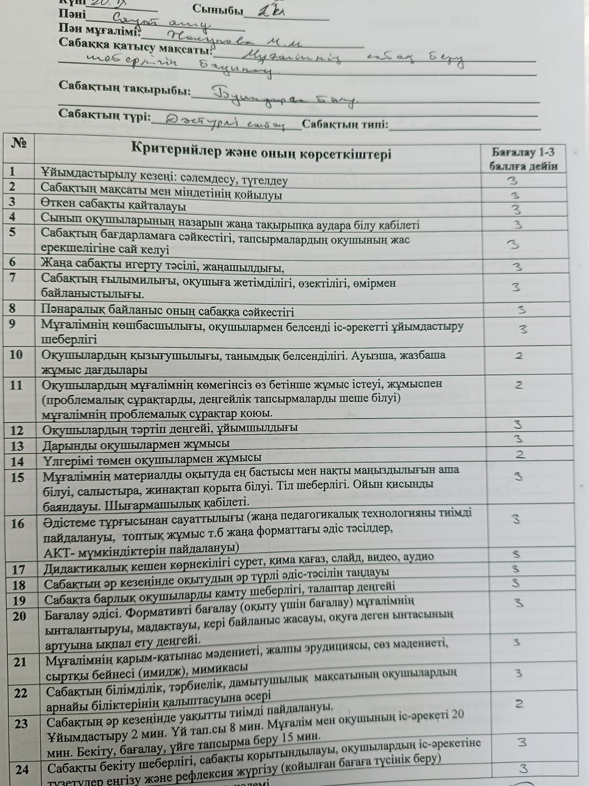 Мектеп директоры Жумакулов Жайк Елеукановичтің сабаққа қатысу парақтары