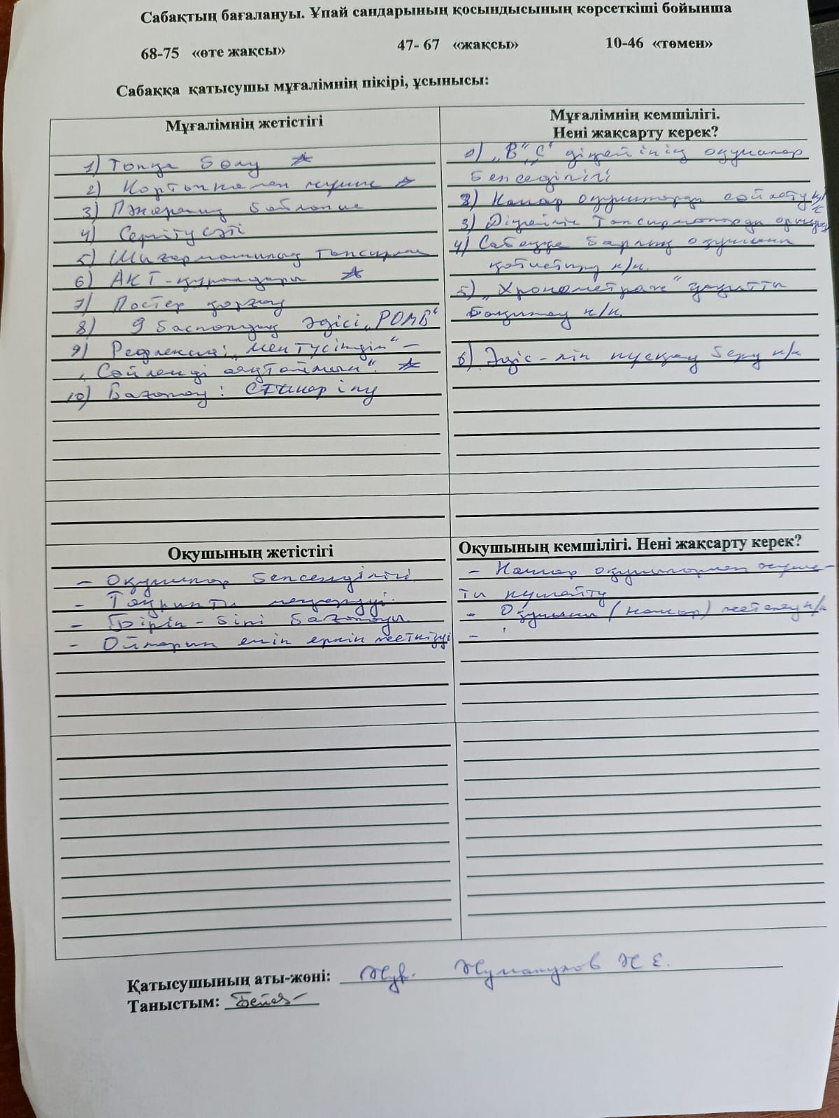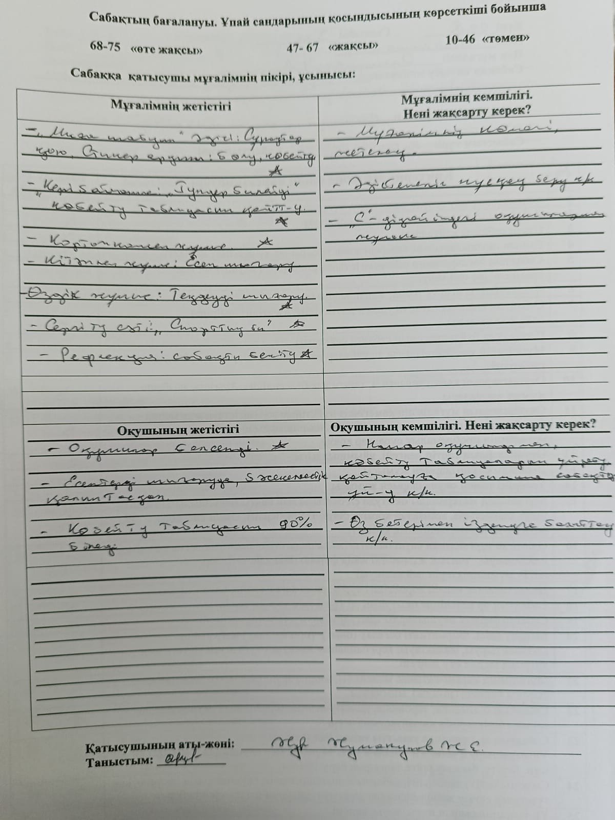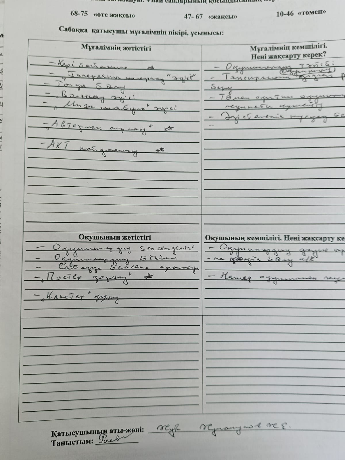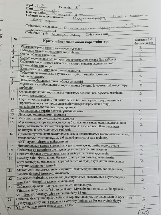Мектеп директоры Жумакулов Жайк Елеукановичтің сабаққа қатысу парақтары