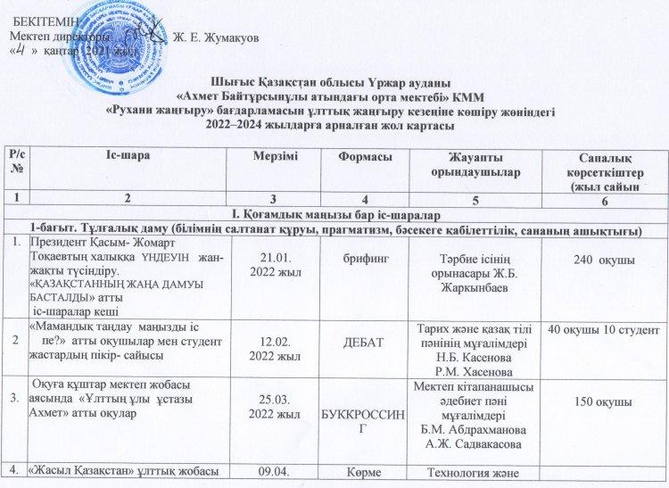 14 январь 2022 0 1 2 3 4 5 "РУХАНИ ЖАҢҒЫРУ" БАҒДАРЛАМАСЫ АЯСЫНДА 2022-2022 ЖЫЛДАРҒА АРНАЛҒАН ІС- ШАРАЛАЛАР ЖОСПАРЫ "РУХАНИ ЖАҢҒЫРУ" БАҒДАРЛАМАСЫ АЯСЫНДА 2022-2022 ЖЫЛДАРҒА АРНАЛҒАН МЕКТЕПІШІЛІК ІС- ШАРАЛАЛАР ЖОСПАРЫ БЕКІТІЛДІ.