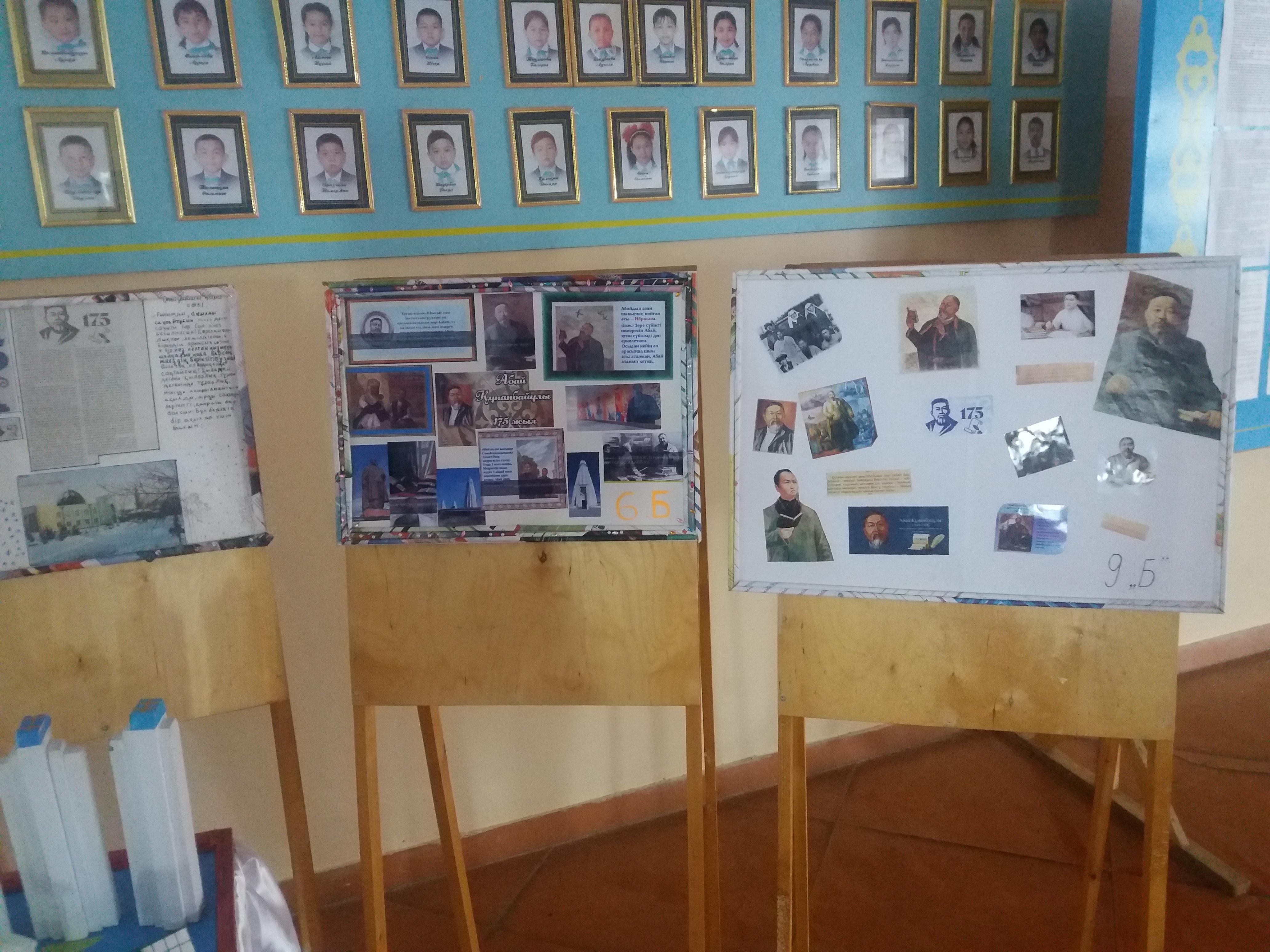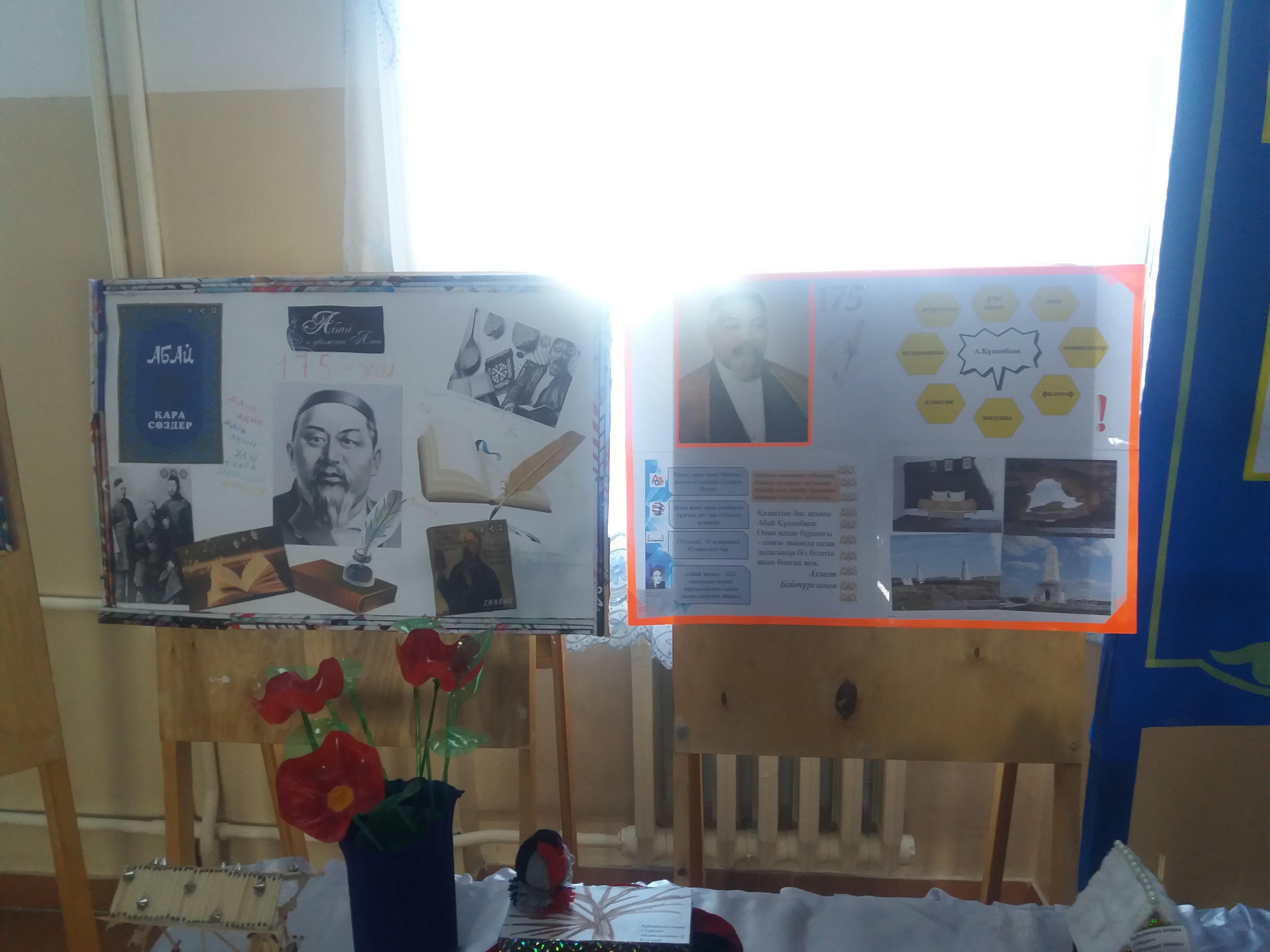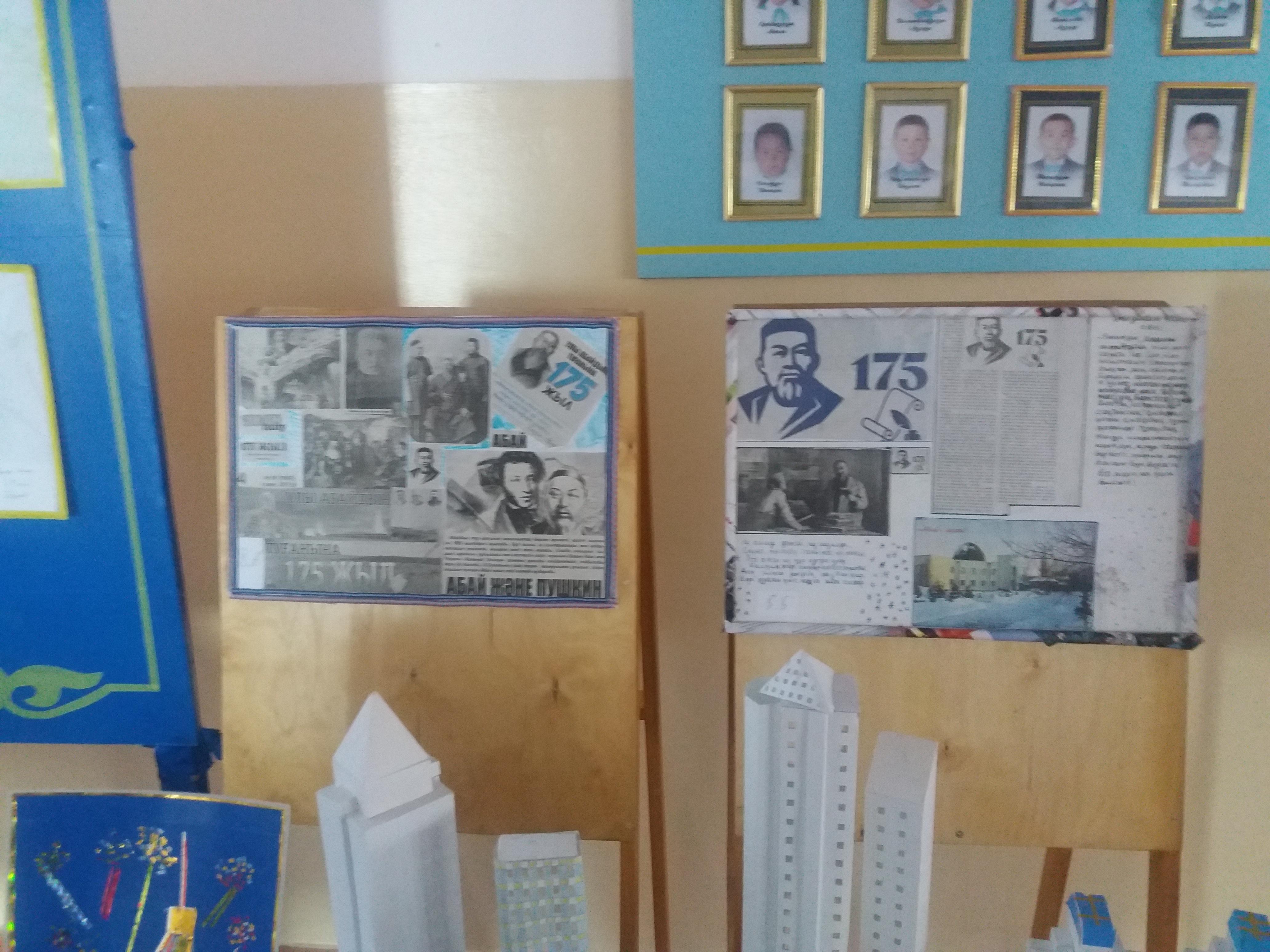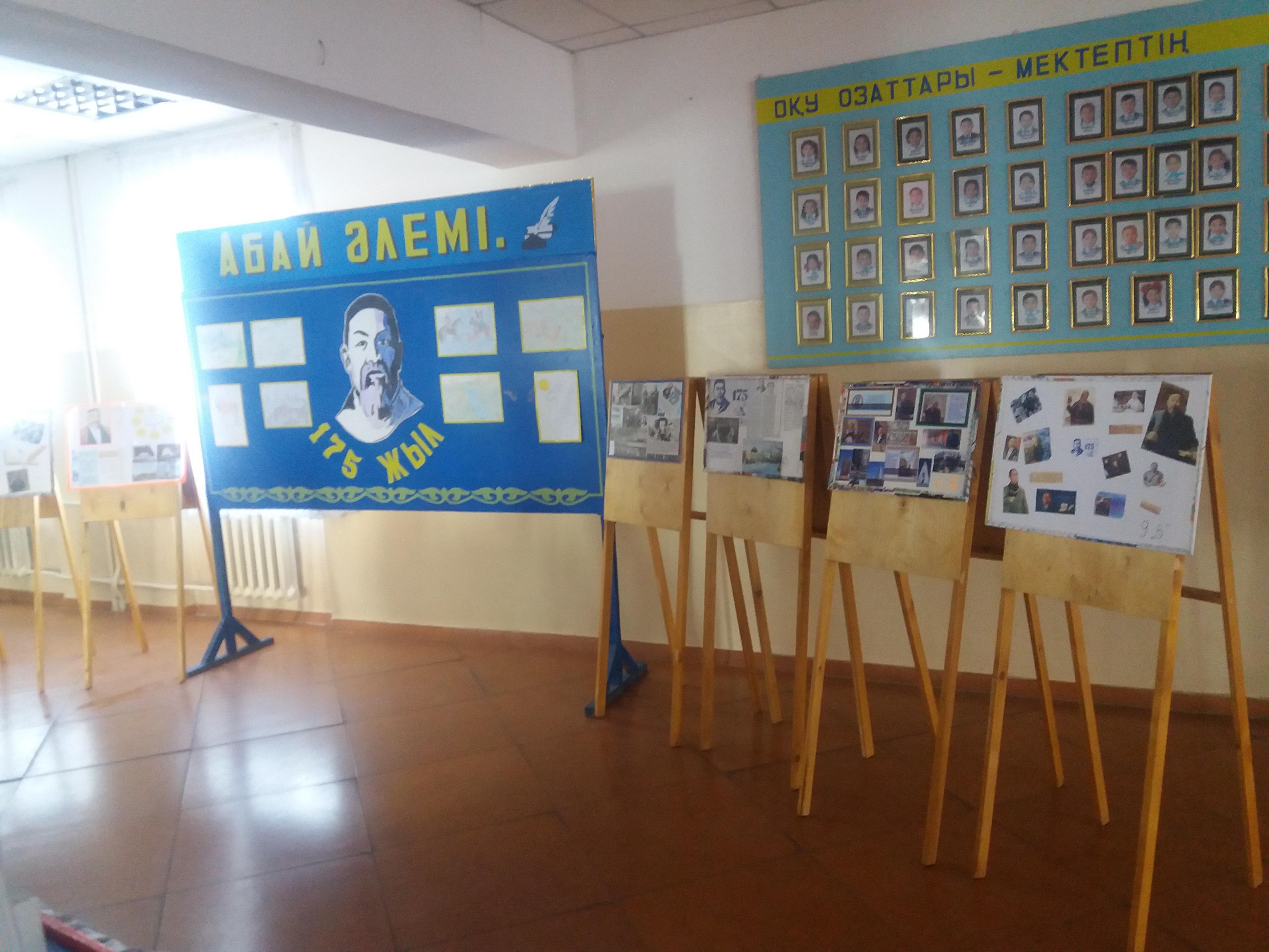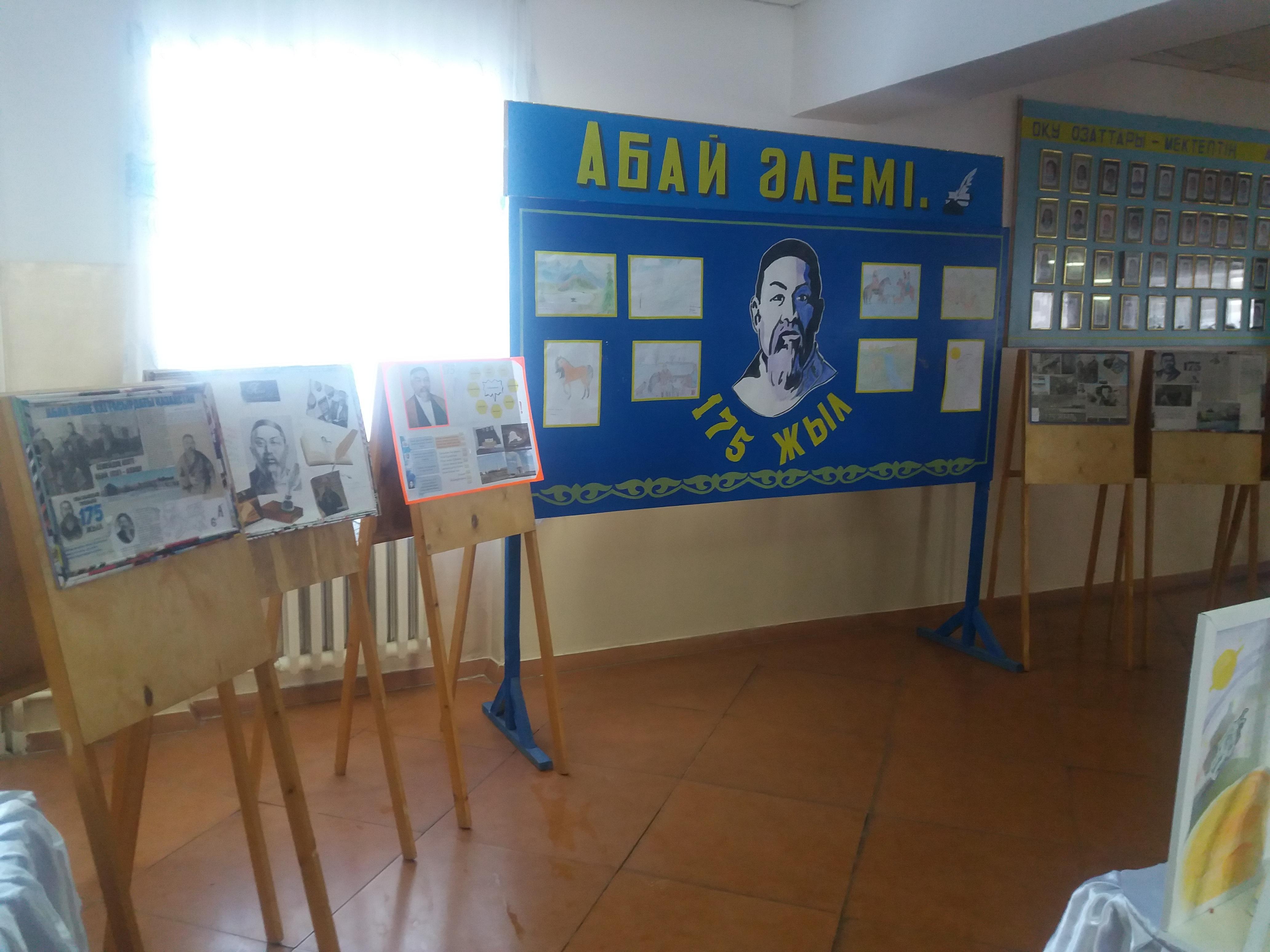Мектебімізде Абай Құнанбайұлының 175 жылдық мерейтойы аясында «Абай әлемі» атты сурет және коллаж байқауы өтті. Оған 5-11 сыныптар қатысты. Оқушылар мен сыныптардың шығармашылық жұмыстары қазылар тарапынан сараланып, қорытындысы шығарылды. Атап айтқанда, 6 «А» сынып оқушылары Мамажанов Біржан мен Хасенов Әлинұр «Шебер суретші», 5 «А» сынып оқушылары Шакиртов Райымбек пен Мақсұтқан Елдос, 5 «Б» сынып оқушысы Сапарғалиева Жаннұр «Жас суретші» бағамымен марапатталды.
