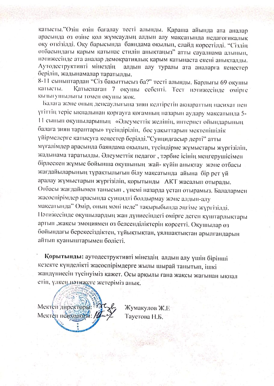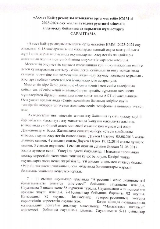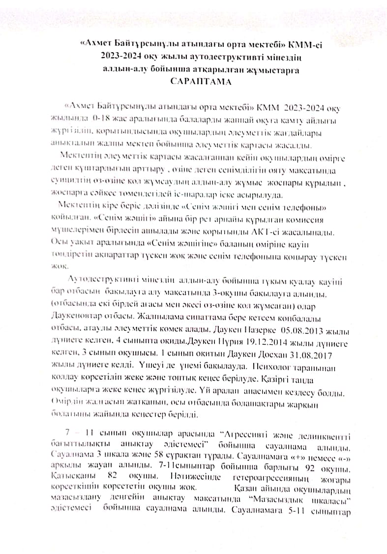 "Ахмет Байтұрсынұлы орта мектебі" КММ-де 2023-2024 оқу жылы І жартыжылдығында аутодеструктивті тінездің алдын алу бойынша жүргізілген жұмыстар » Абай облысы білім басқармасы Мақаншы ауданы білім бөлімінің "Ахмет Байтұрсынұлы атындағы орта мектебі" КММ