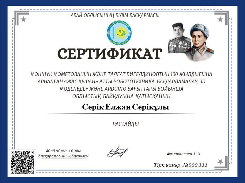 облыстық Робототехника, бағдарламалау, 3D моделдеу бойынша облыстық байқауға қатысып СЕРТИФИКАТ иеленді.