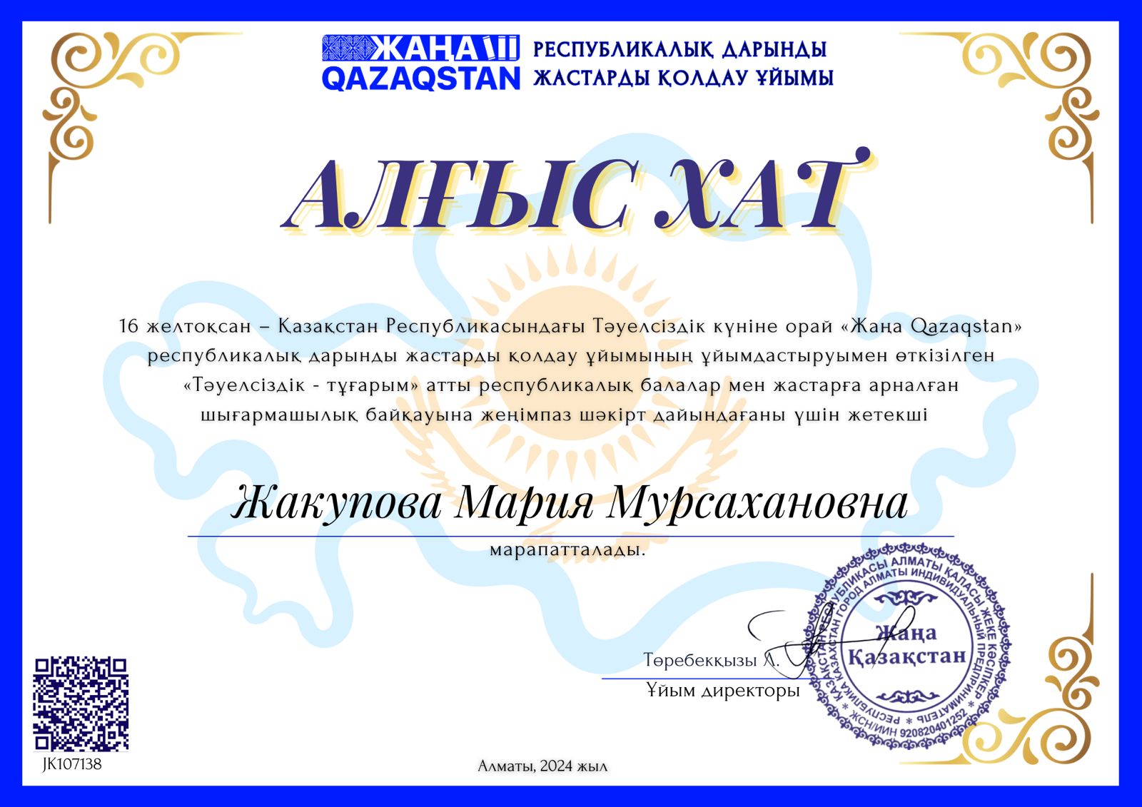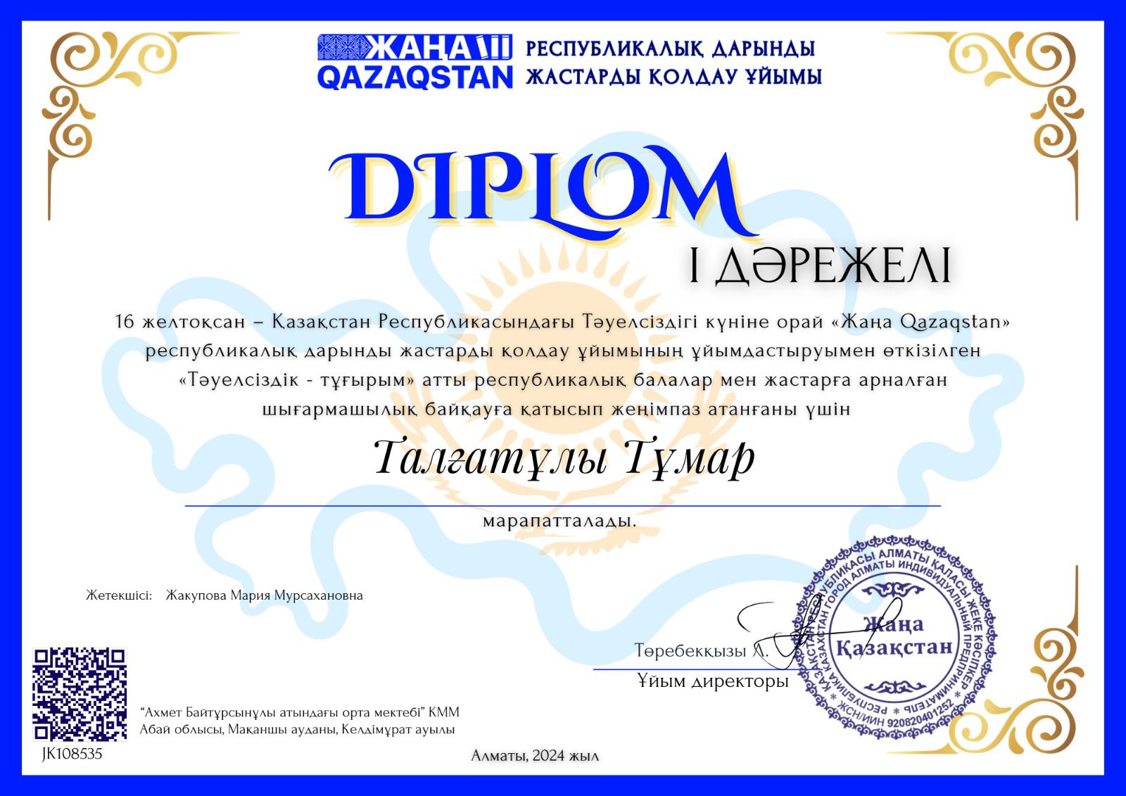 15 декабрь 2024 0 1 2 3 4 5 "Тәуелсіздік - тұғырым" атты республикалық балаларға арналған шығармашылық байқаудың жеңімпазы