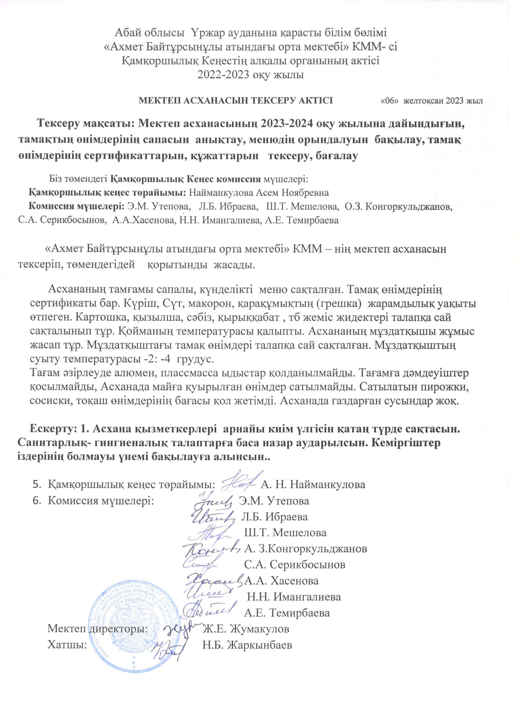 06 декабрь 2023 0 1 2 3 4 5 Мектеп асханасын тексеру актісі "Ахмет Байтұрсынұлы атындаға орта мектебі" КММ- сі Қамқоршылық кеңес мүшелері мектеп асханасын тексеріп, қорытынды жасады.