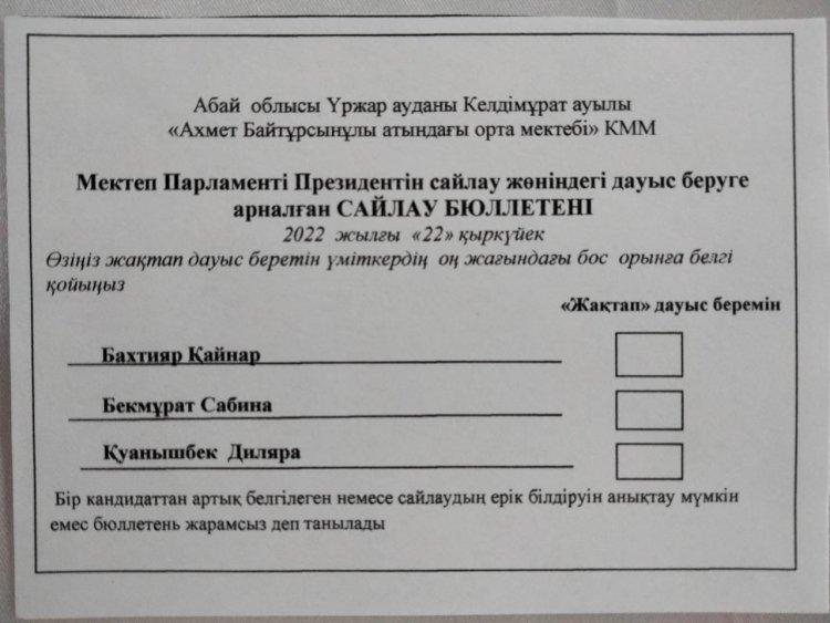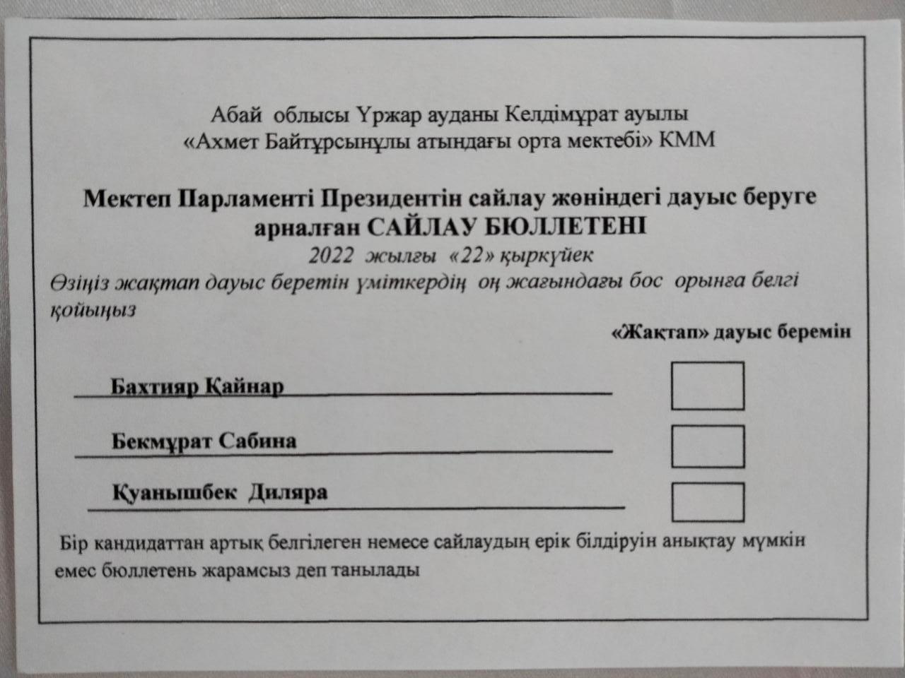 Мектеп Парламенті Президентінің сайлауы 22 қыркүйек 2022 жыл » Абай облысы білім басқармасы Мақаншы ауданы білім бөлімінің "Ахмет Байтұрсынұлы атындағы орта мектебі" КММ