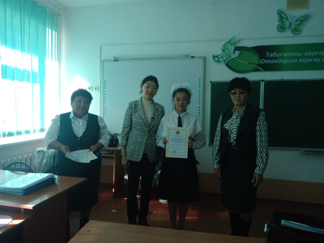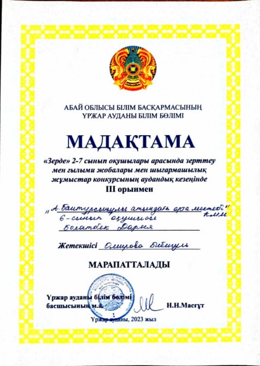 "Зерде" 2-7 сынып оқушылары арасында зерттеу мен ғылыми жобалары мен шығармашылық жұмыстар конкурсының аудандық кезеңінде ІІІ орынмен "Ахмет Байтұрсынұлы атындағы орта мектебі" КММ 6 "а" сынып оқушысы Болатбек Дария Абай облысы білім басқармасының Үржар ауданы білім бөлімі басшысының м.а. Н.Н.Масғұттың мадақтамасымен марапатталды.