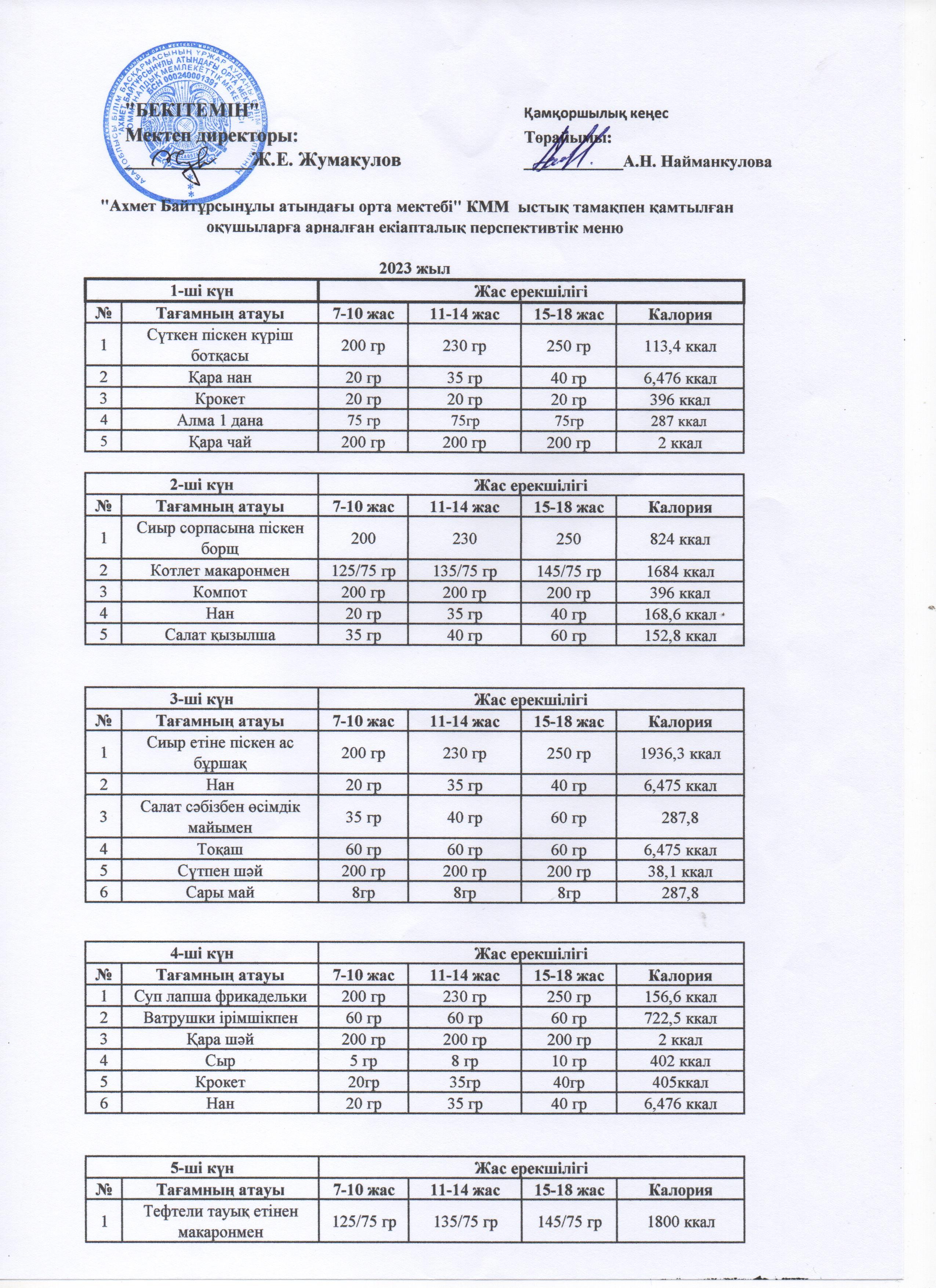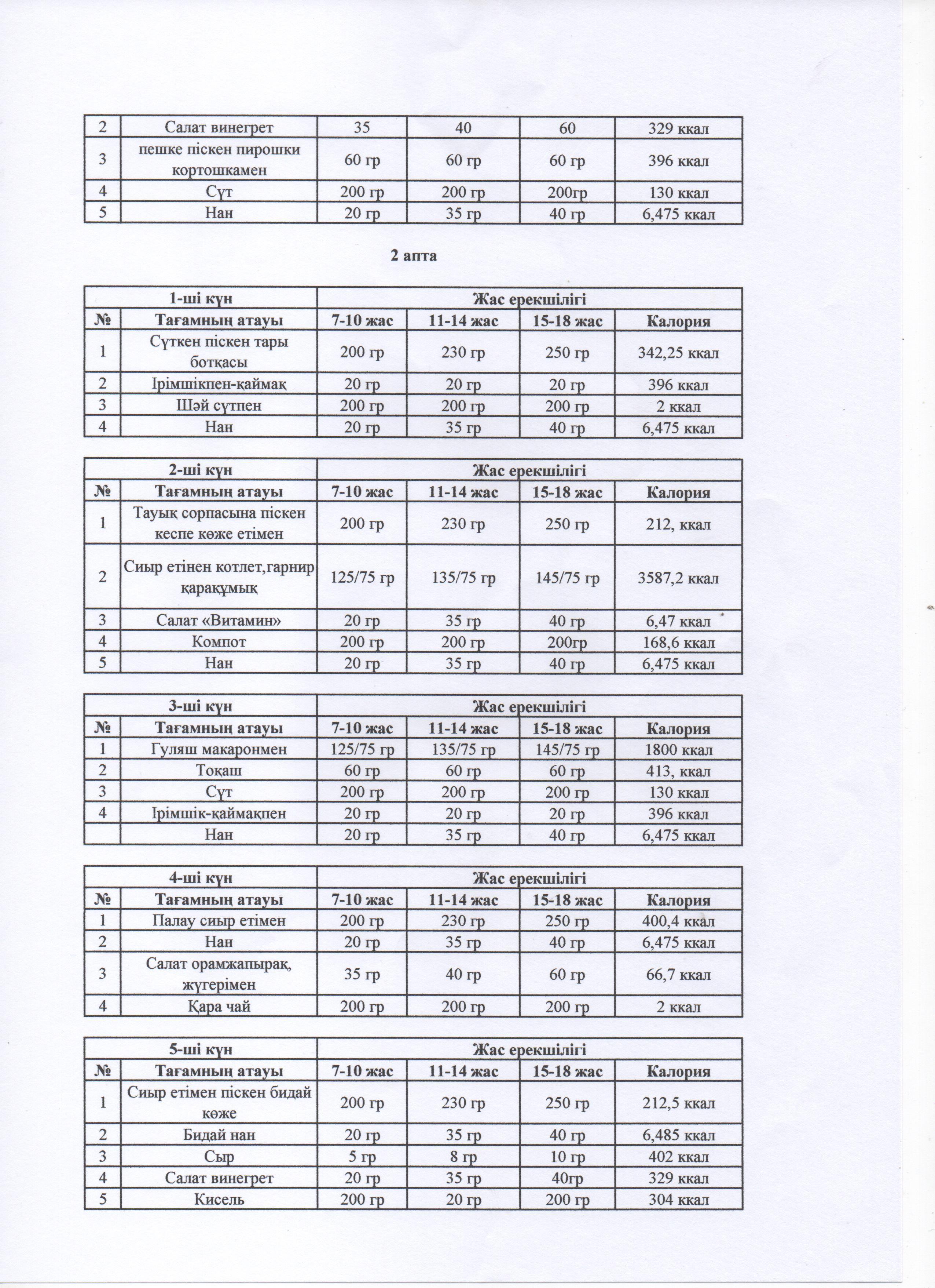 2022-2023 оқу жылы ІІ жарты жылдығына арналған ас мәзірі: