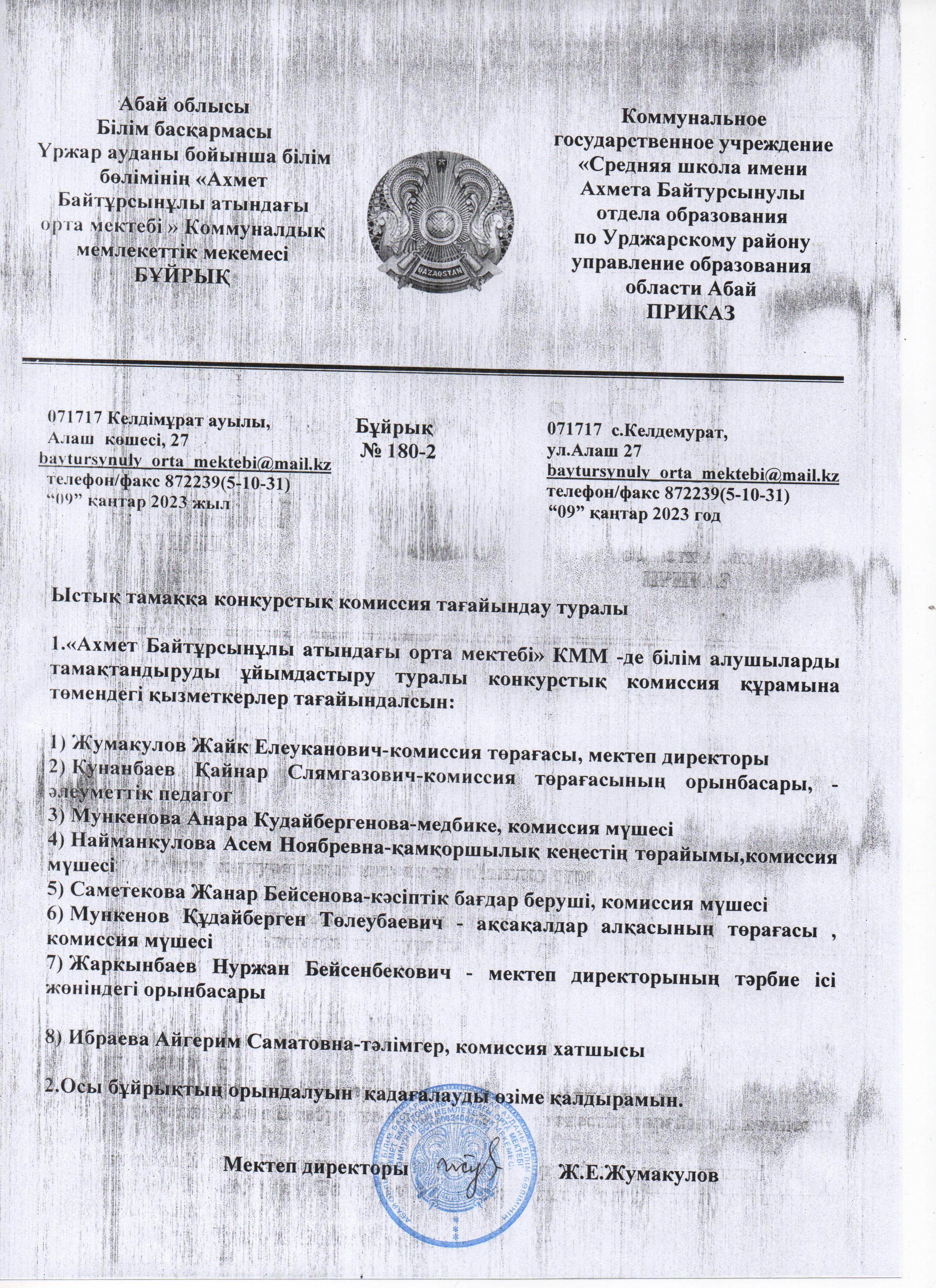 Ыстық тамаққа конкурстық комиссияны тағайындау туралы №180-2 бұйрық