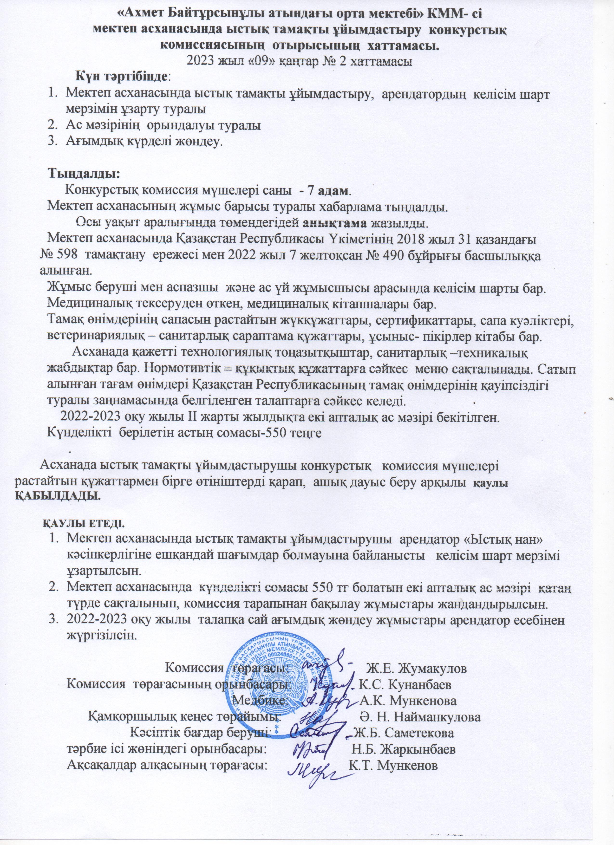 Мектеп асханасында ыстық тамақтыұйымдастыру туралы конкурстық комиссиясының хаттамасы № 2