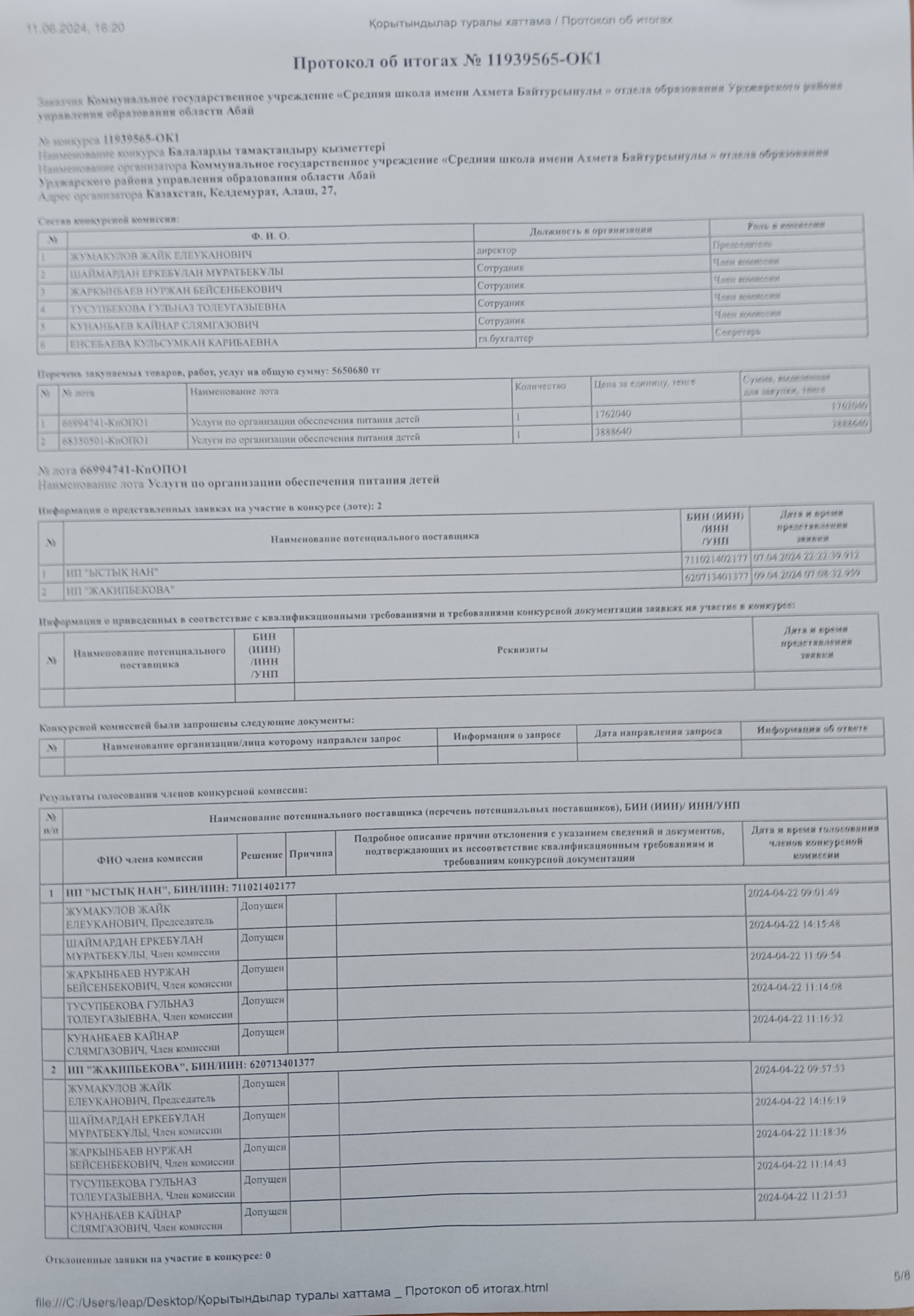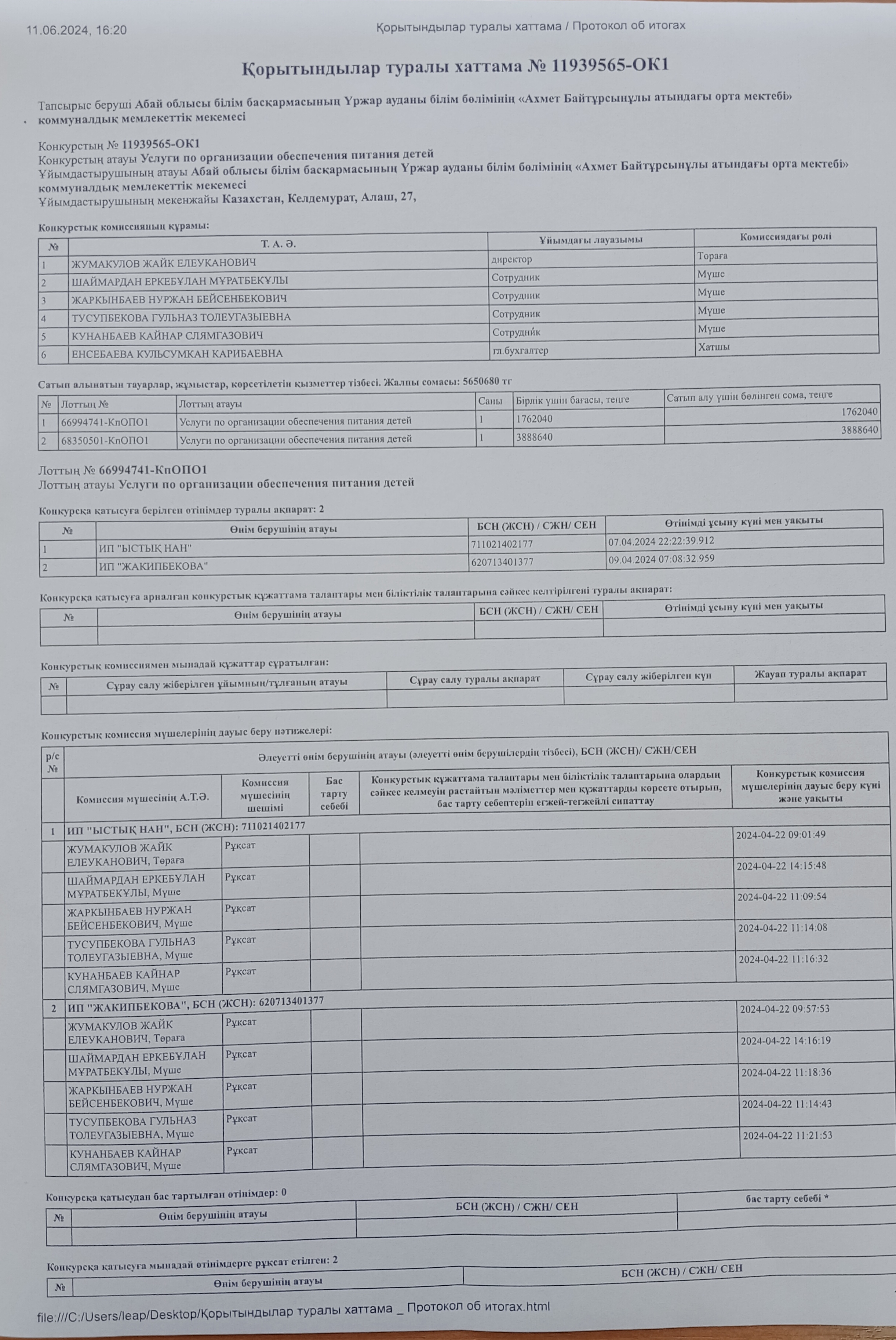 Конкурстық қорытындылар туралы хаттама № 11939565-OK1 22. 04. 2024 жыл » Абай облысы білім басқармасы Мақаншы ауданы білім бөлімінің "Ахмет Байтұрсынұлы атындағы орта мектебі" КММ
