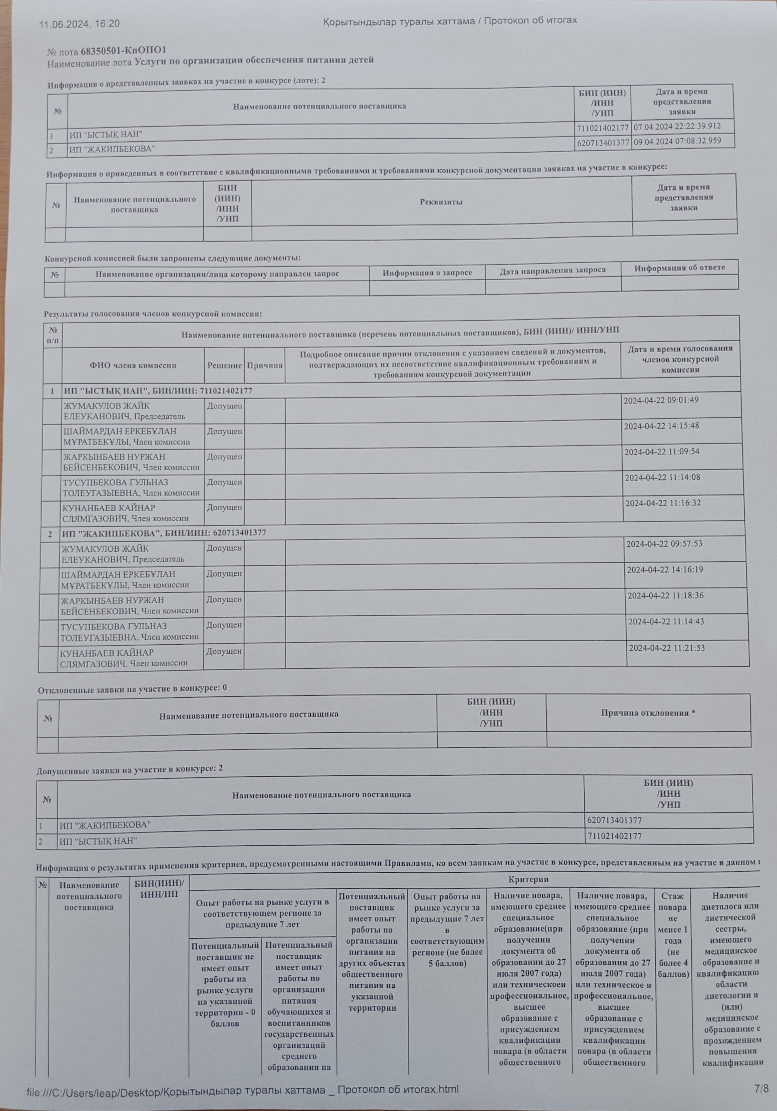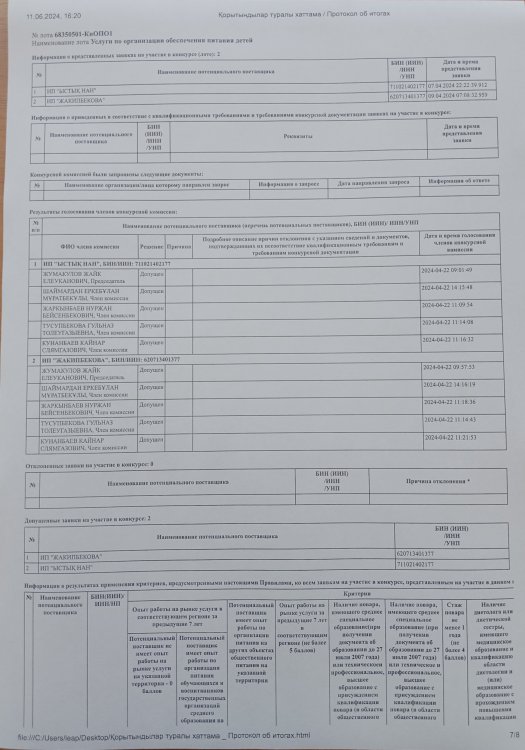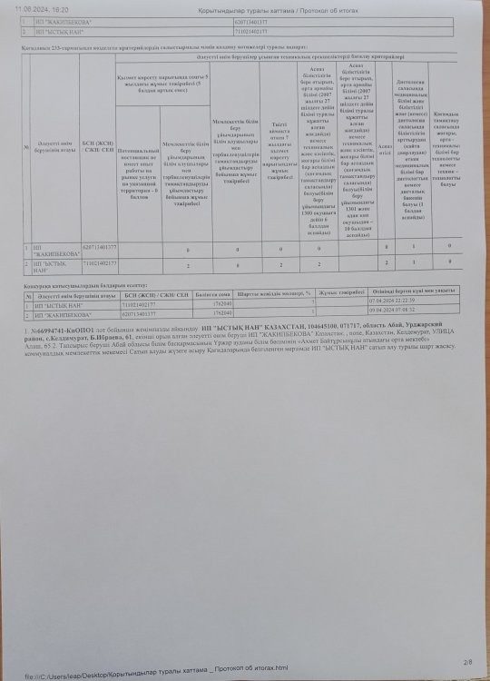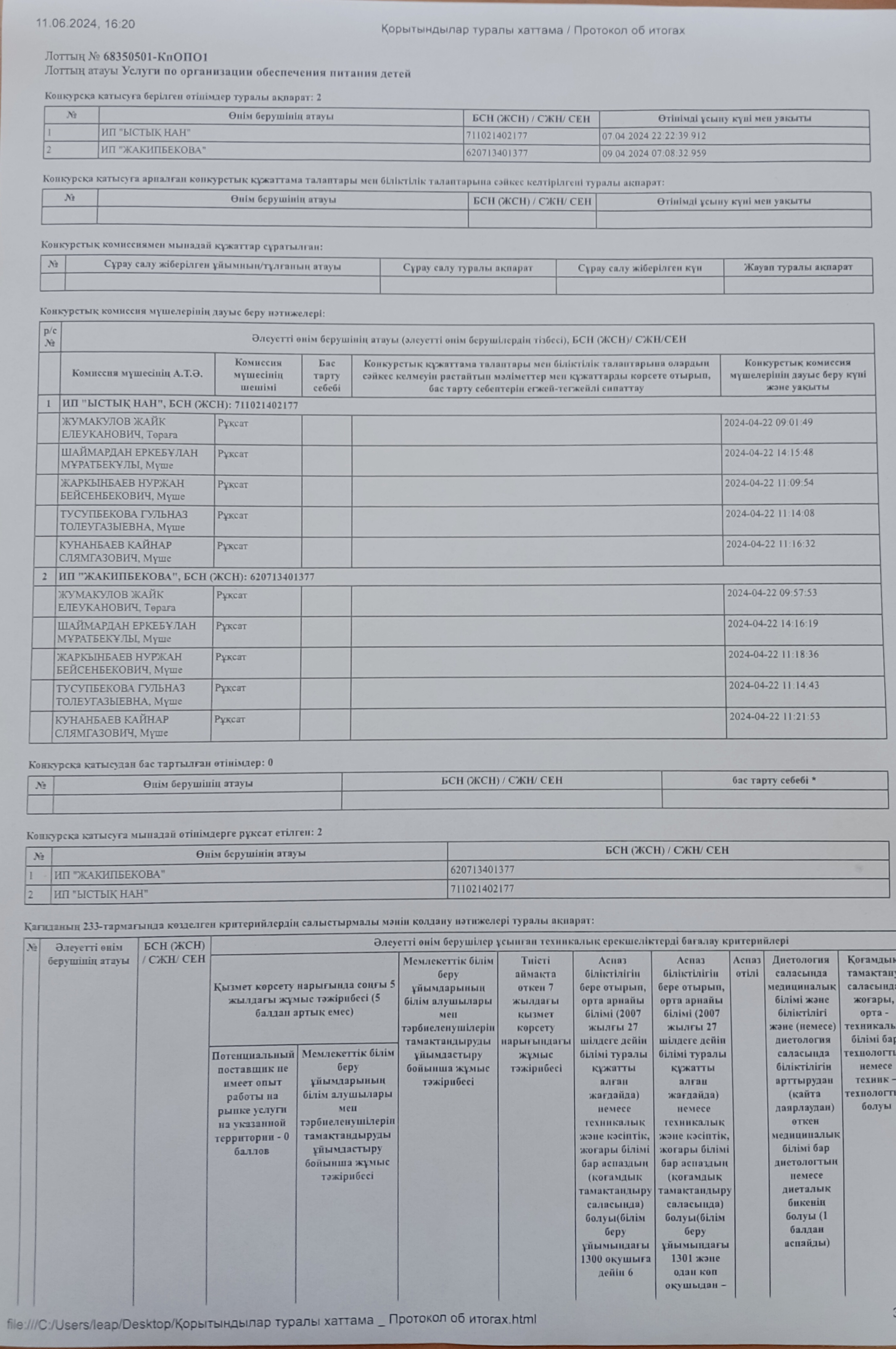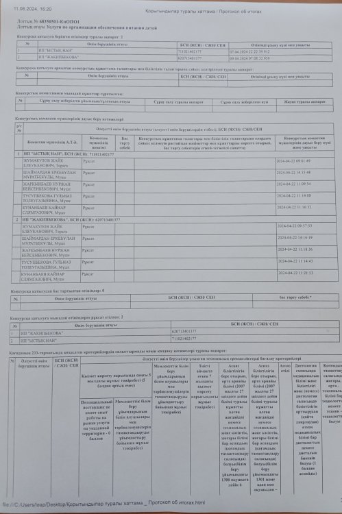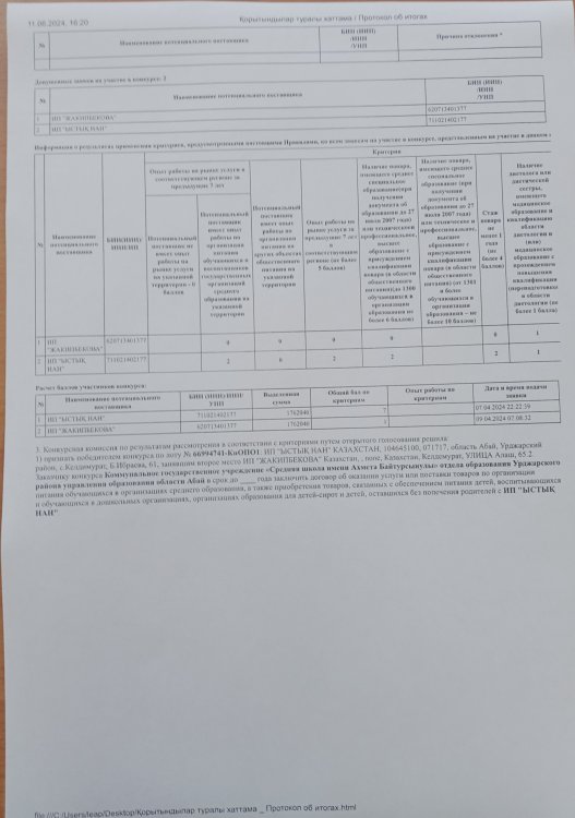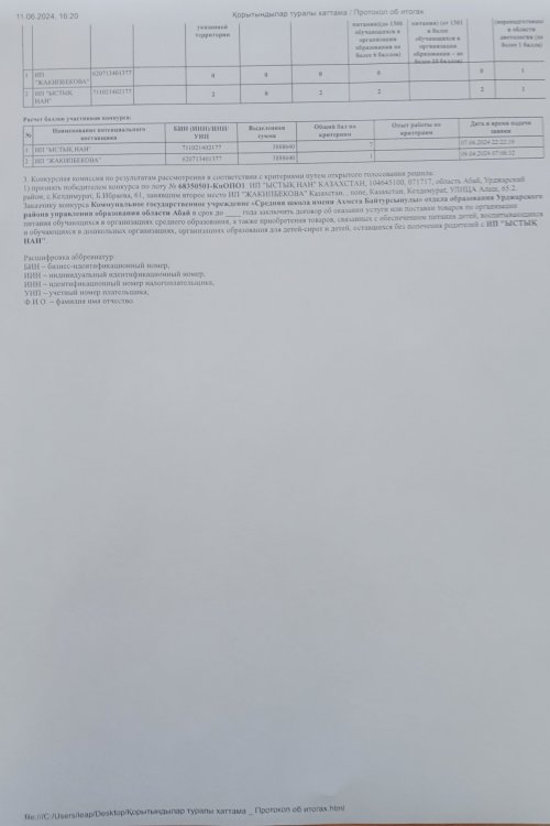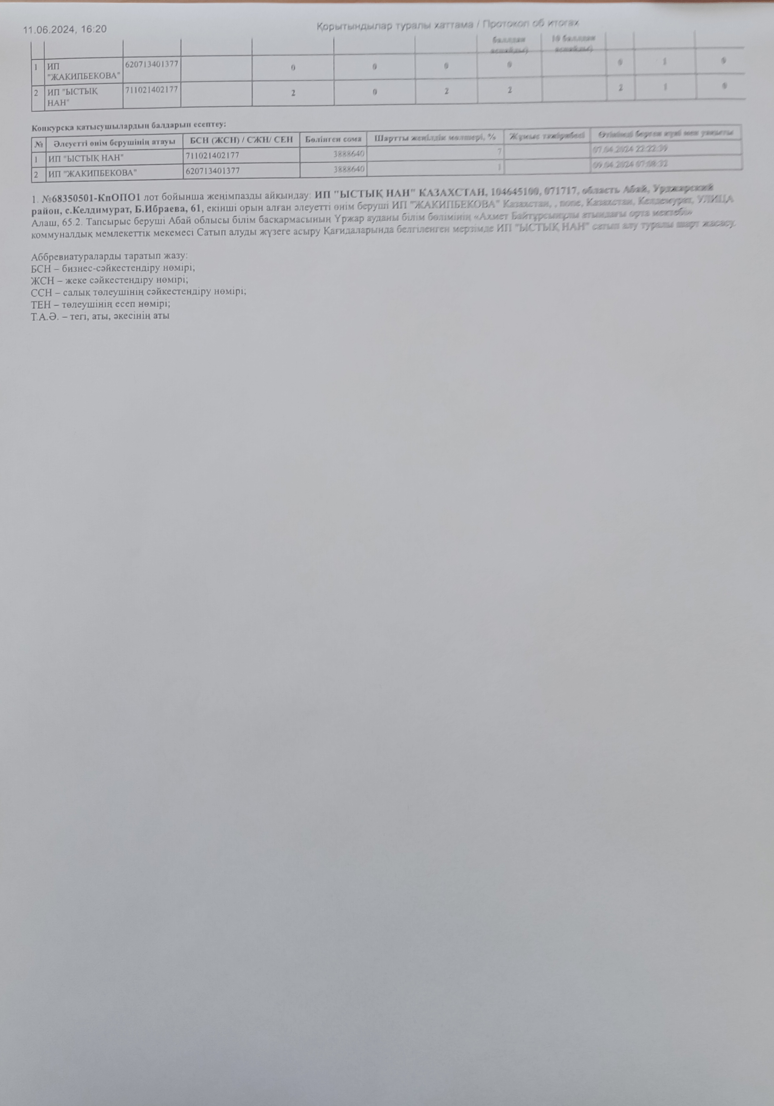 Конкурстық қорытындылар туралы хаттама № 11939565-OK1 22. 04. 2024 жыл
