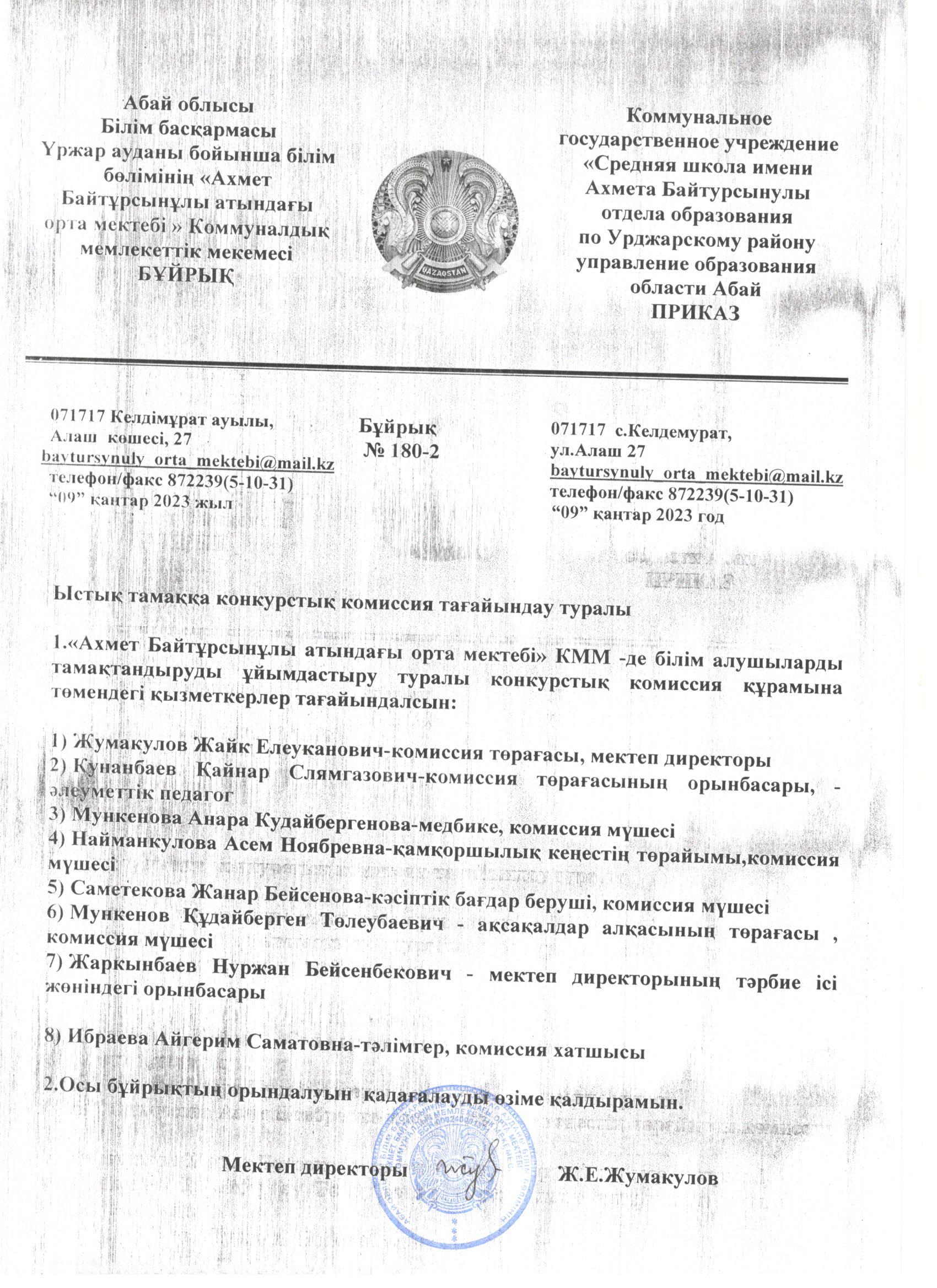 9 қаңтар 2023 жыл "Ахмет Байтұрсынұлы атындағы орта мектебі" КММ- сі мектеп асханасында ыстық тағамды ұйымдастыратын конкурстық комиссия тағайындады. Онық құрамына 7 адам кірді.