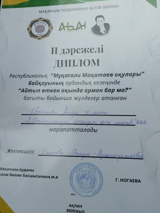 "Мұқағали Мақатаев оқулары" байқауының жүлдегері » Абай облысы білім басқармасы Мақаншы ауданы білім бөлімінің "Ахмет Байтұрсынұлы атындағы орта мектебі" КММ