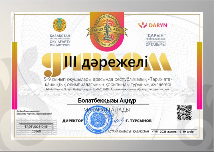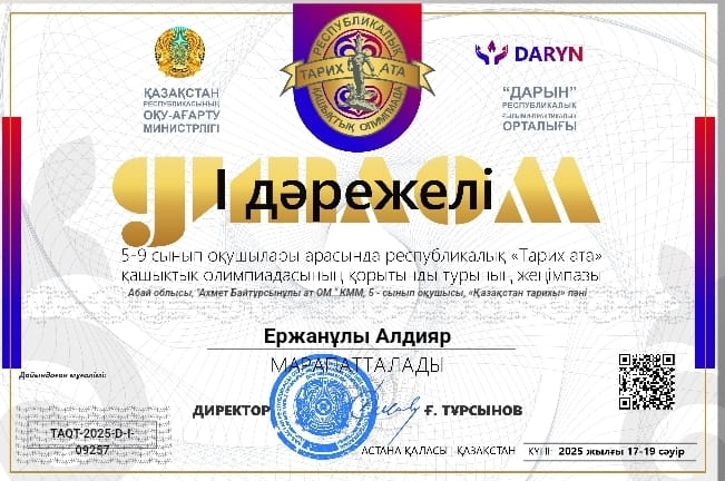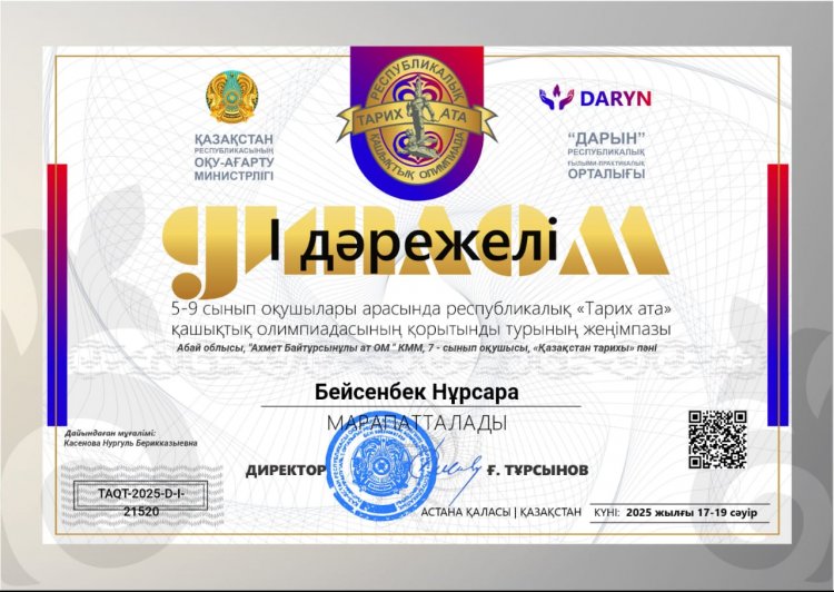 "Тарих ата" қашықтық олимпиадасының жүлдегерлері » Абай облысы білім басқармасы Мақаншы ауданы білім бөлімінің "Ахмет Байтұрсынұлы атындағы орта мектебі" КММ