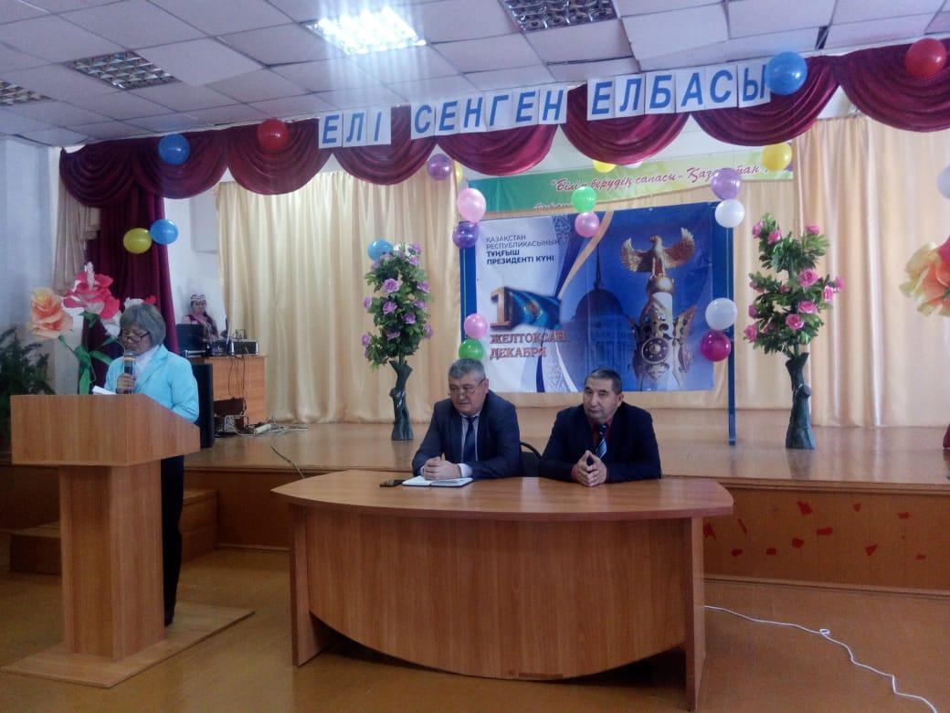 1 желтоқсан Қазастан Республикасының Тұңғыш Президенті күніне байланысты өскелең жас ұрпақтың тұлғалық дамуы үшін , Елбасының сындарлы саясатын ,кеменгерлігін үлгі ,мақтан тұтуға,елін, жерін қорғайтын патриат азамат тәрбиелеу мақсатында мектепішілік жоспар жасалынып бекітілді. Аудандық мәслихат депутаты, мектеп директоры Жумакулов Ж.Е. «Елі сенген –Елбасы» тақырыбында дөңгелек үстел ұйымдастырылып өткізілді. Дөңгелек үстелге мектеп оқушылары мен ұстаздары және қамқоршлық кеңес мүшесі Адаев М.И. қатысты.Дөңгелек үстел барысында Елбасының өмір тарихы мен саяси өмірінің бастауы жайлы оқушылар арасында сұрақ-жауап пікір алмасу өткізілді. Елбасының «Елбасы жолы» фильмінен үзінділер көрсетіліп, слайд-шоу арқылы әңгіме-пікір жүргізілді.