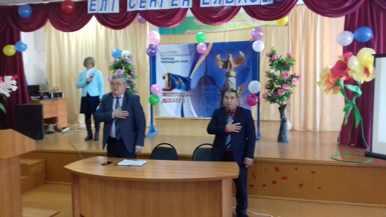 Аудандық мәсихат депутаты, мектеп директоры Жумакулов Ж.Е. ҚР Тәуелсіздік жолында талай арыстарымыз жан қиғанын, Елбасының салиқалы саясатының арқасында «Қазақстан» деген ел бар екенін әлемге паш еткендігі, қазақстанның әлеуметтік- экономикалық және қоғамдық-саяси дамуына және аудан көлемінде елбасының тапсырмалары қалай жүзеге асып жатқандығы жайында әңгіме қозғады