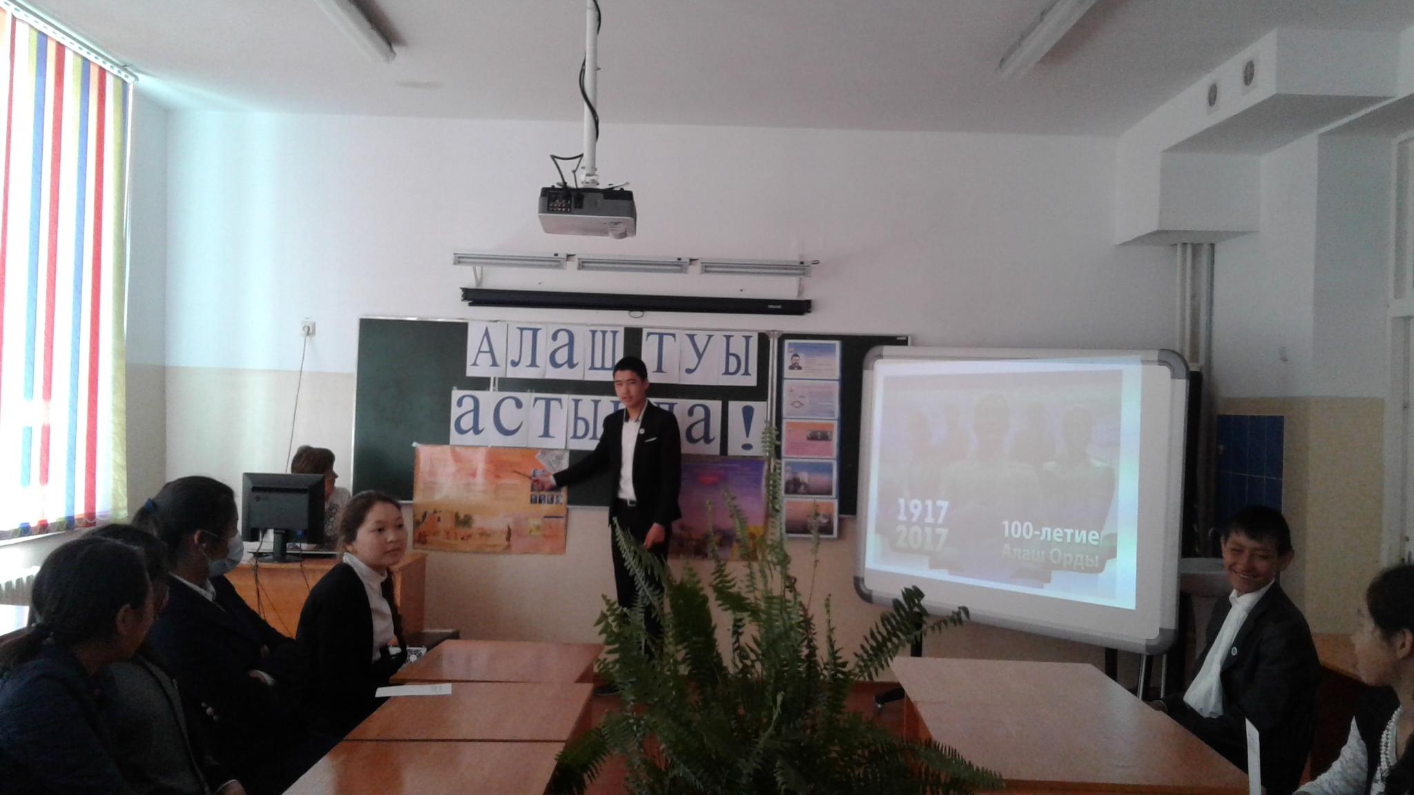 Атап айтқанда 10 сынып оқушысы Надирбаева Тоғжан мен Маратов Ескендір оқушылар алаш қозғалысының тарихын, алаш партиясының бағдарламасын талдап берді.