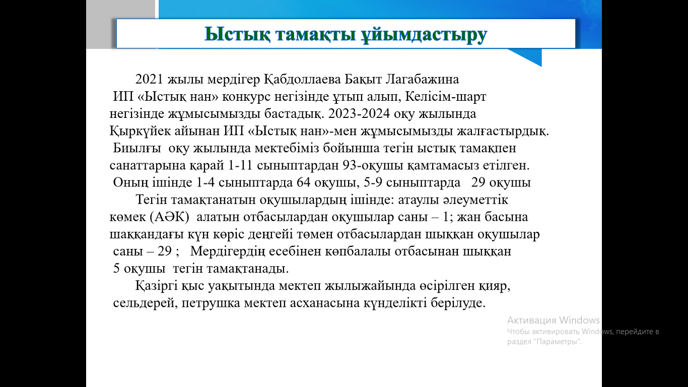 Мектепте дұрыс тамақтануды ұйымдастыру » Абай облысы білім басқармасы Мақаншы ауданы білім бөлімінің "Ахмет Байтұрсынұлы атындағы орта мектебі" КММ
