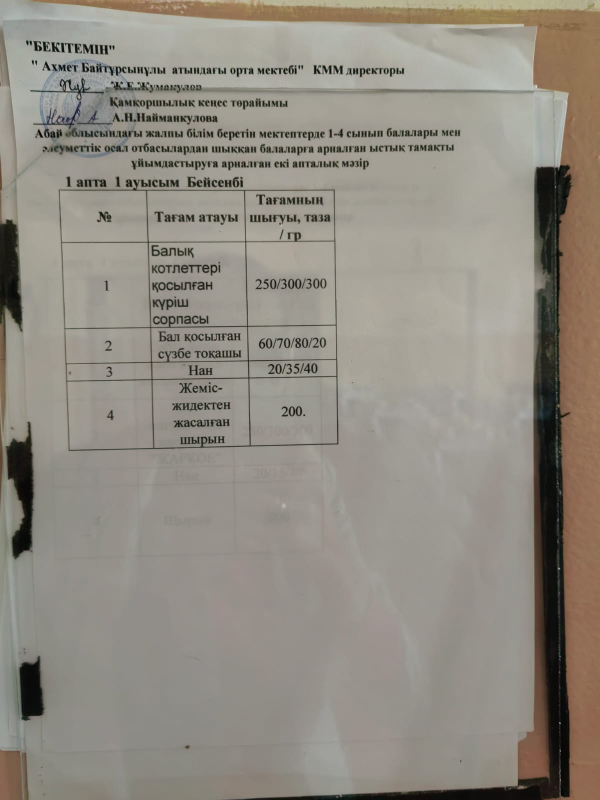 "Ахмет Байтұрсынұлы атындағы орта мектебі" КММ-де мектеп асханасының жұмысы санитарлық-гигиеналық талаптарға сай ұйымдастырылған.