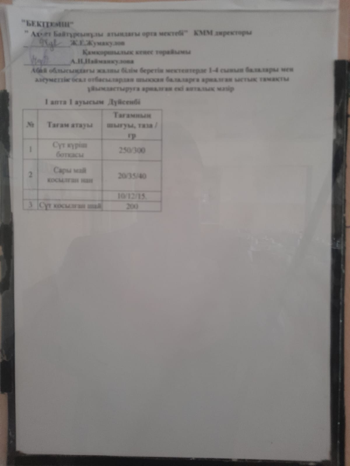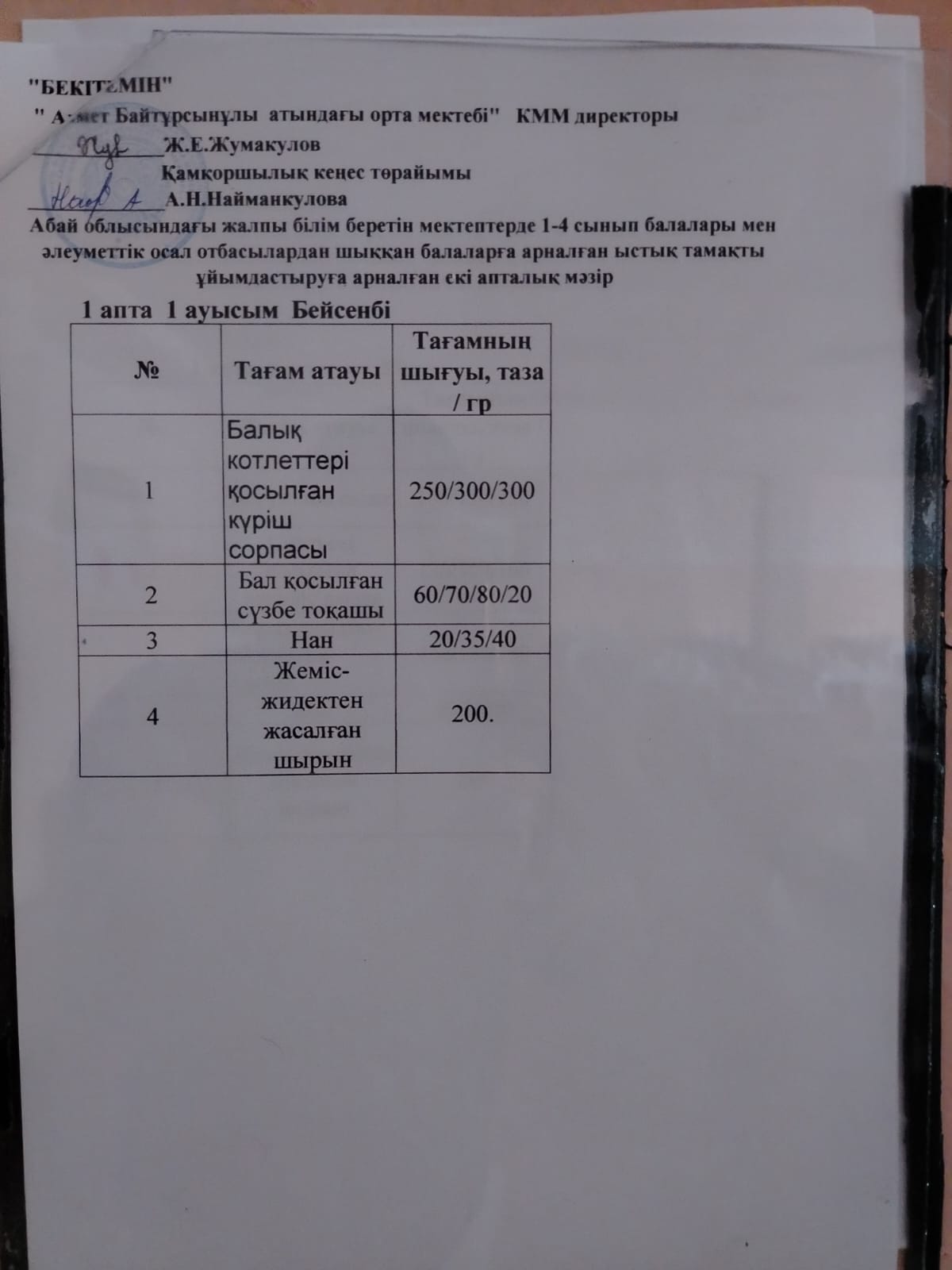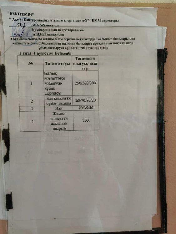 5. Ас мәзірін күн сайын көрнекі жерге іліп, тағамның құрамы мен калориясы толық жазылуы тиіс.