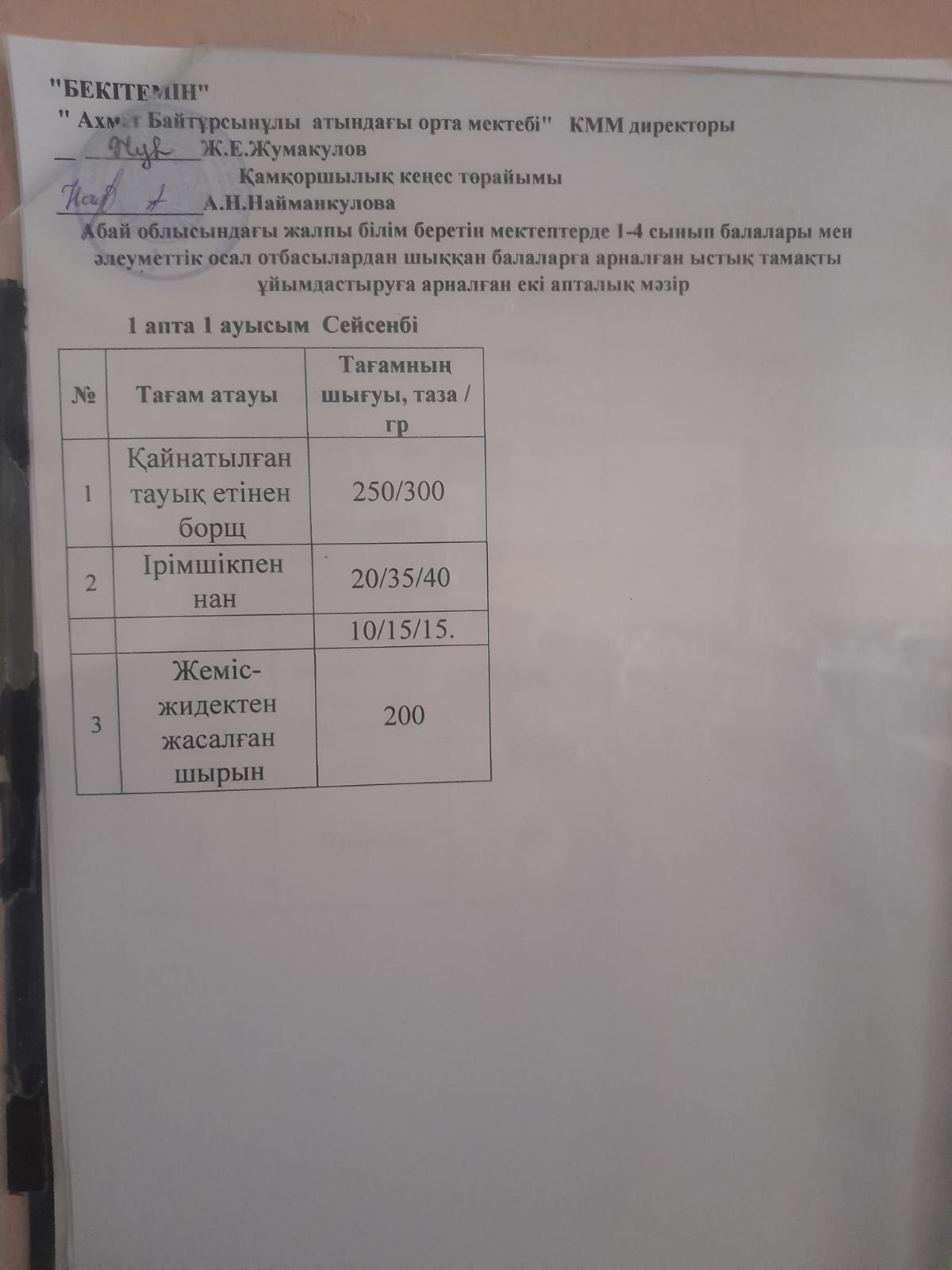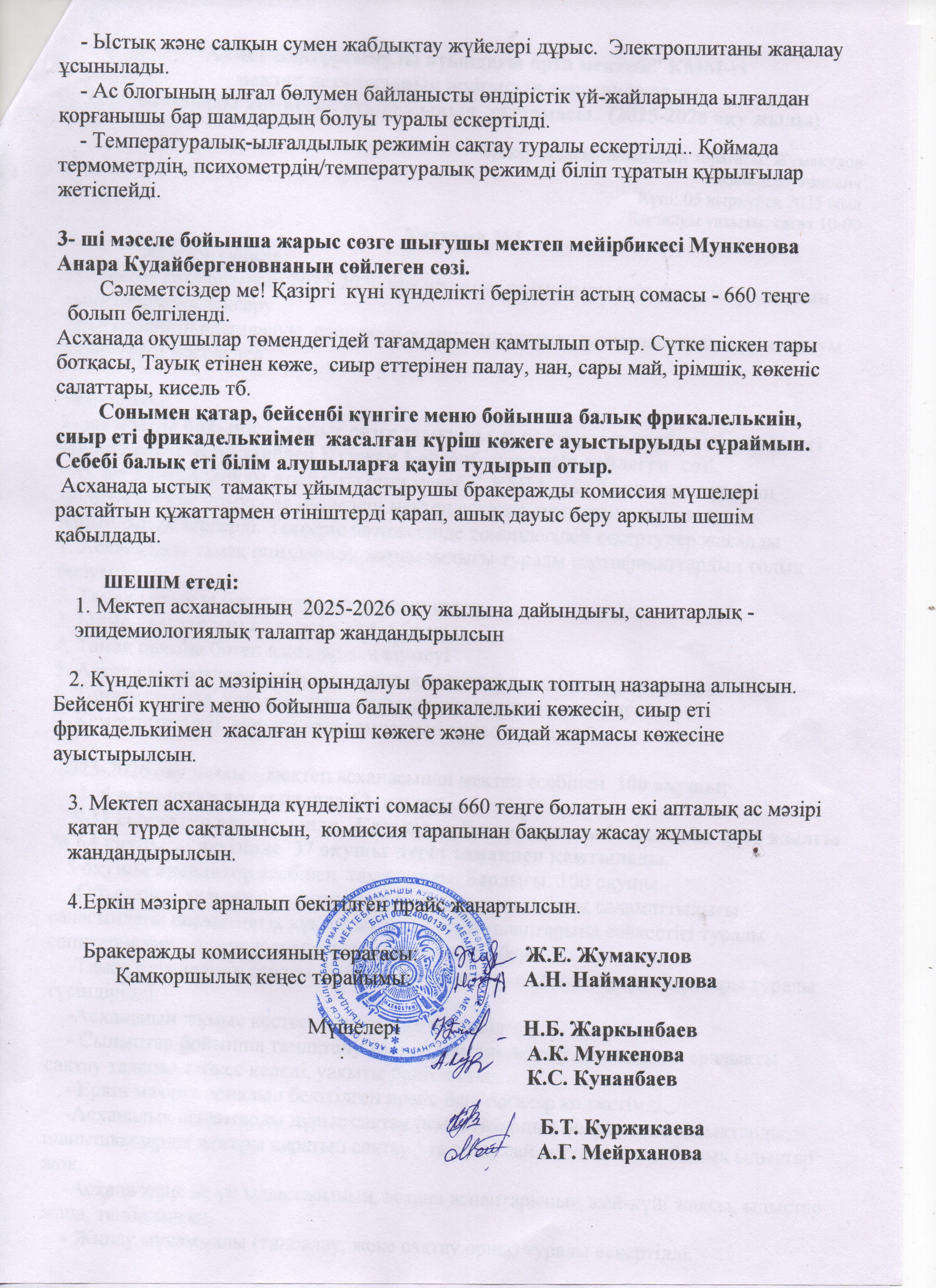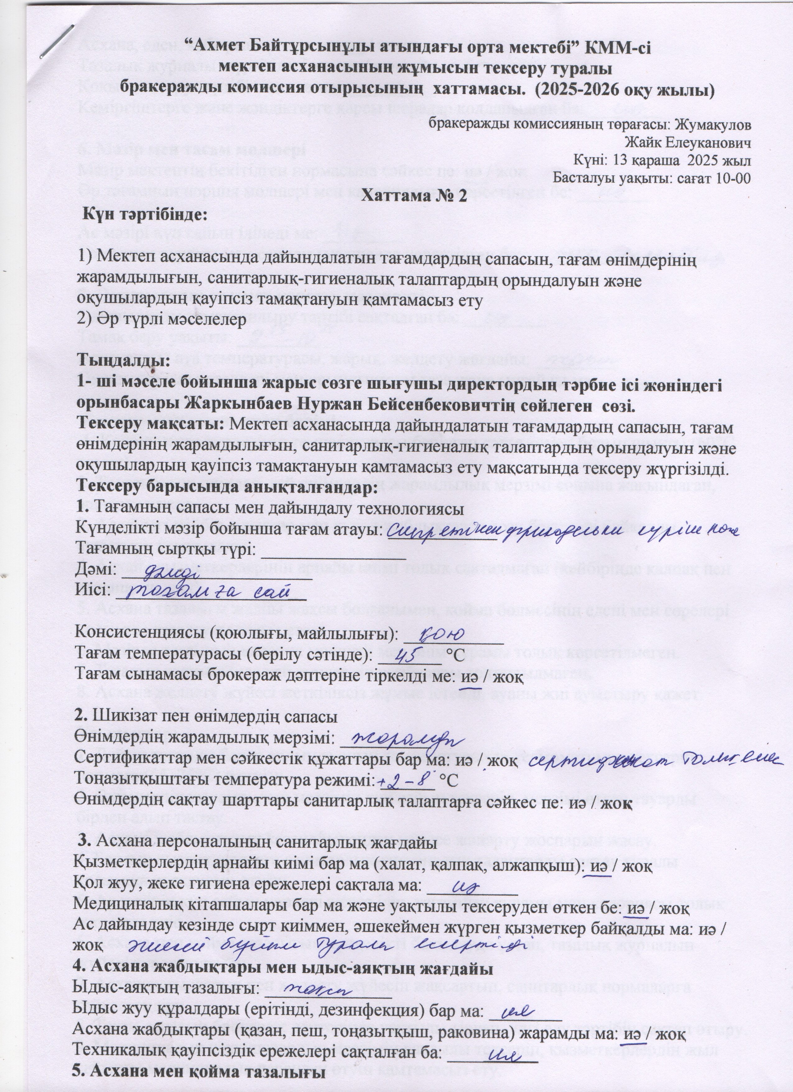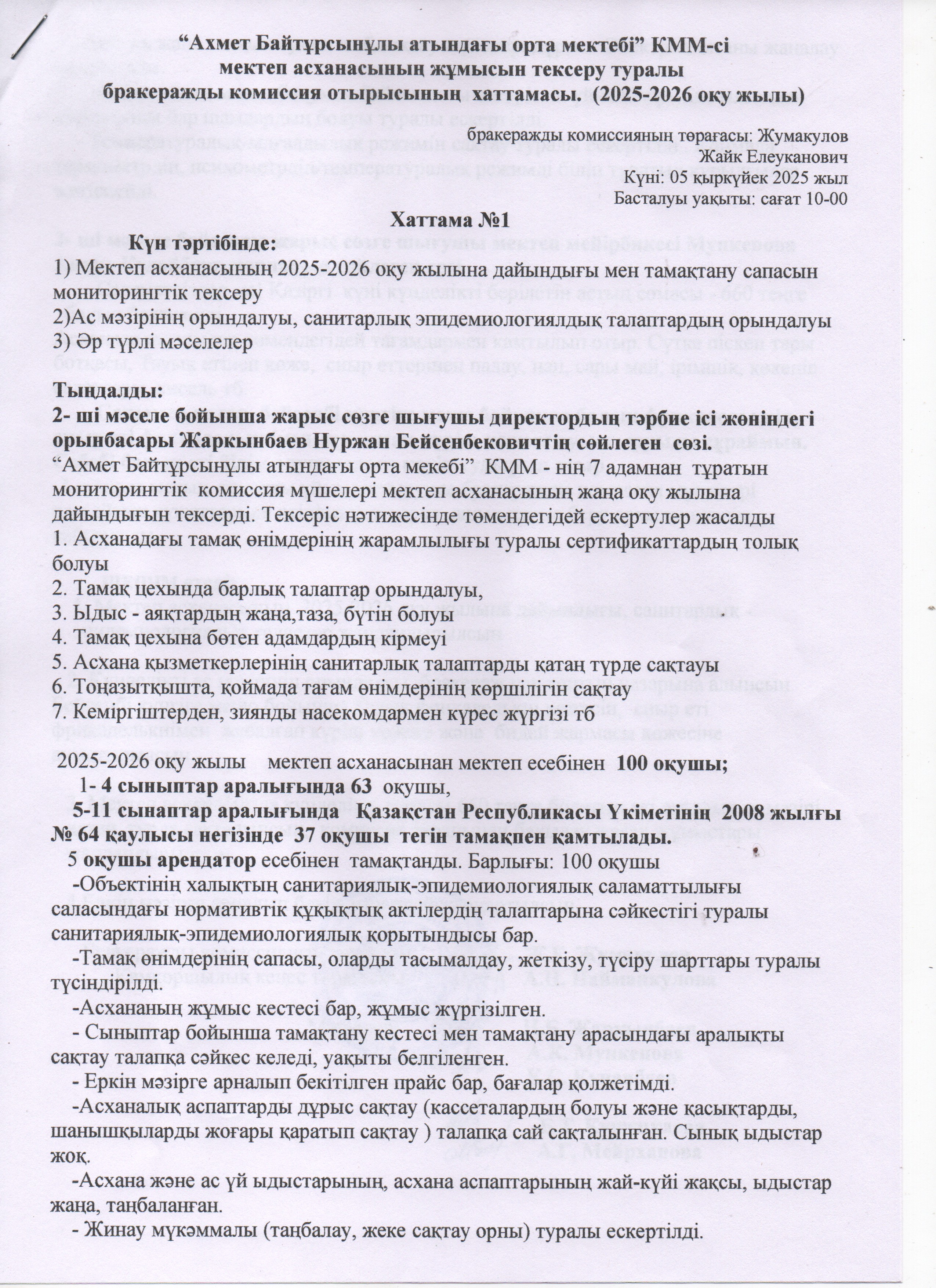Бракераж комиссиясының хаттамасы. Хаттама №1 http://blagodarnoe.mektebi.kz/pitanie/995-brakerazh-komissijasyny4-hattamasy-hattama-1.html http://blagodarnoe.mektebi.kz/pitanie/995-brakerazh-komissijasyny4-hattamasy-hattama-1.html 1) Мектеп асханасының 2025-2026 оқу жылына дайындығы мен тамақтану сапасын мониторингтік тексеру
