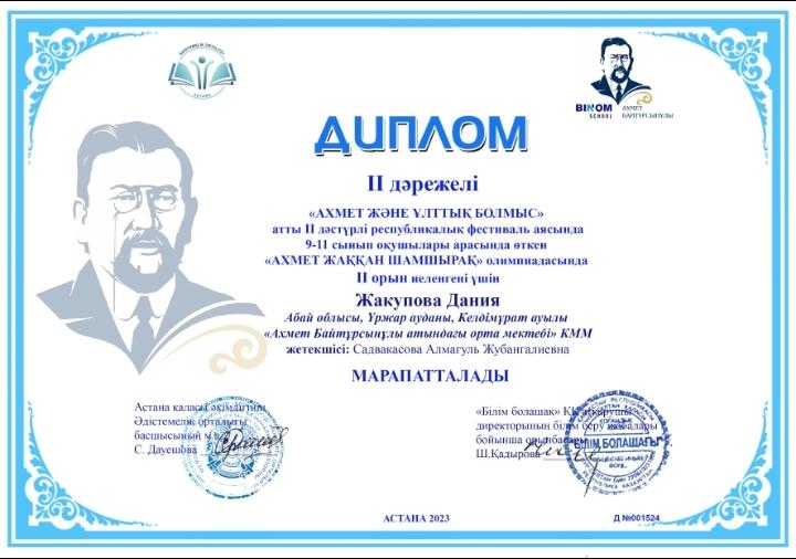"АХМЕТ ЖӘНЕ ҰЛТТЫҚ БОЛМЫС" атты ІІ дәстүрлі республикалық фестиваль аясында 9-11 сынып оқушылары арасында өткен "АХМЕТ ЖАҚҚАН ШАМШЫРАҚ" олимпиадасында ІІ орын иеленгені үшін Жакупова Дания ІІ дәрежелі дипломмен марапатталды.