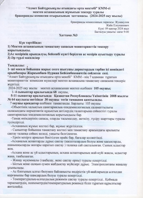 Бракеражды комиссияның № 3 хаттамасы. 2024-2025 оқу жылы