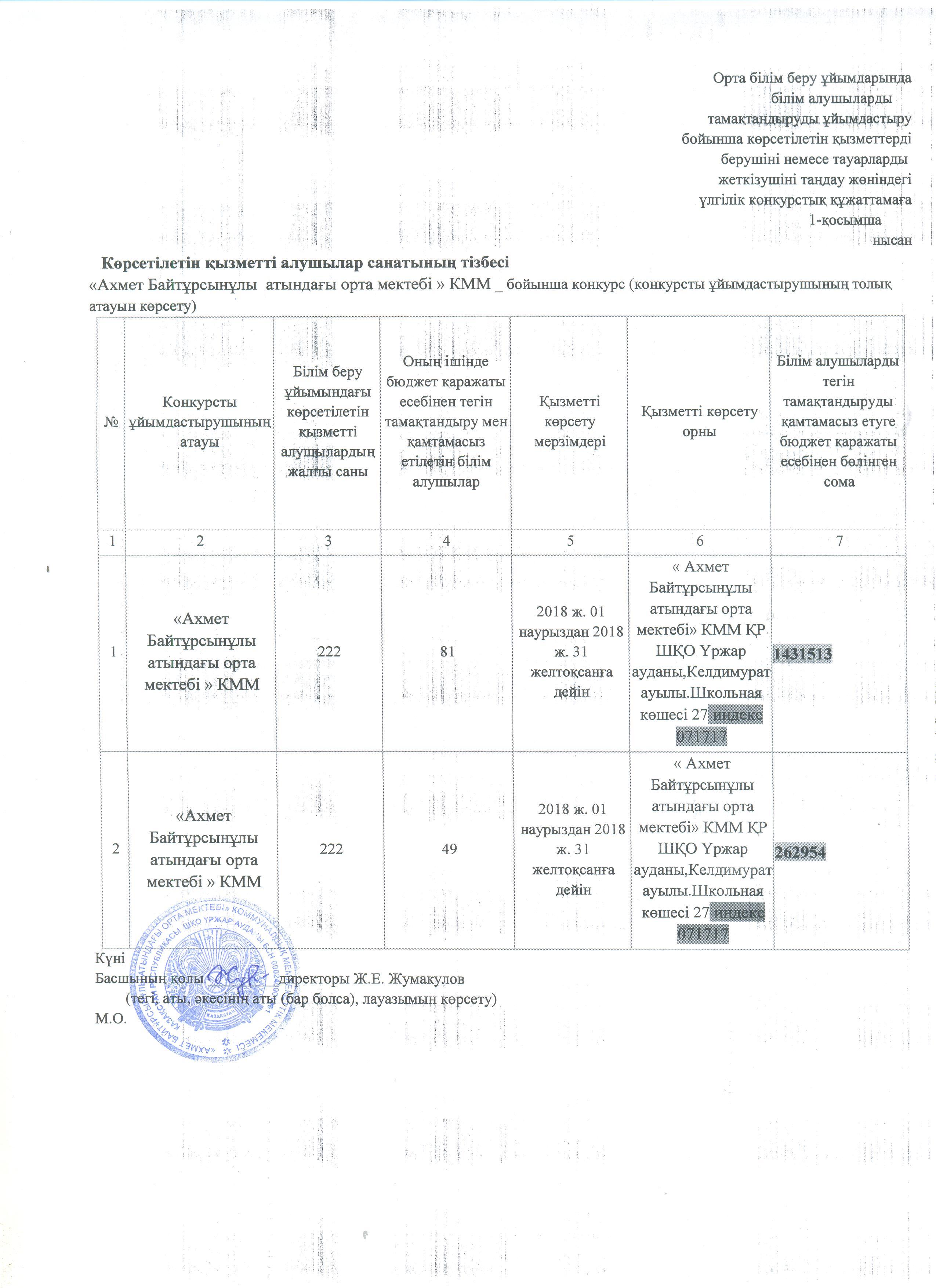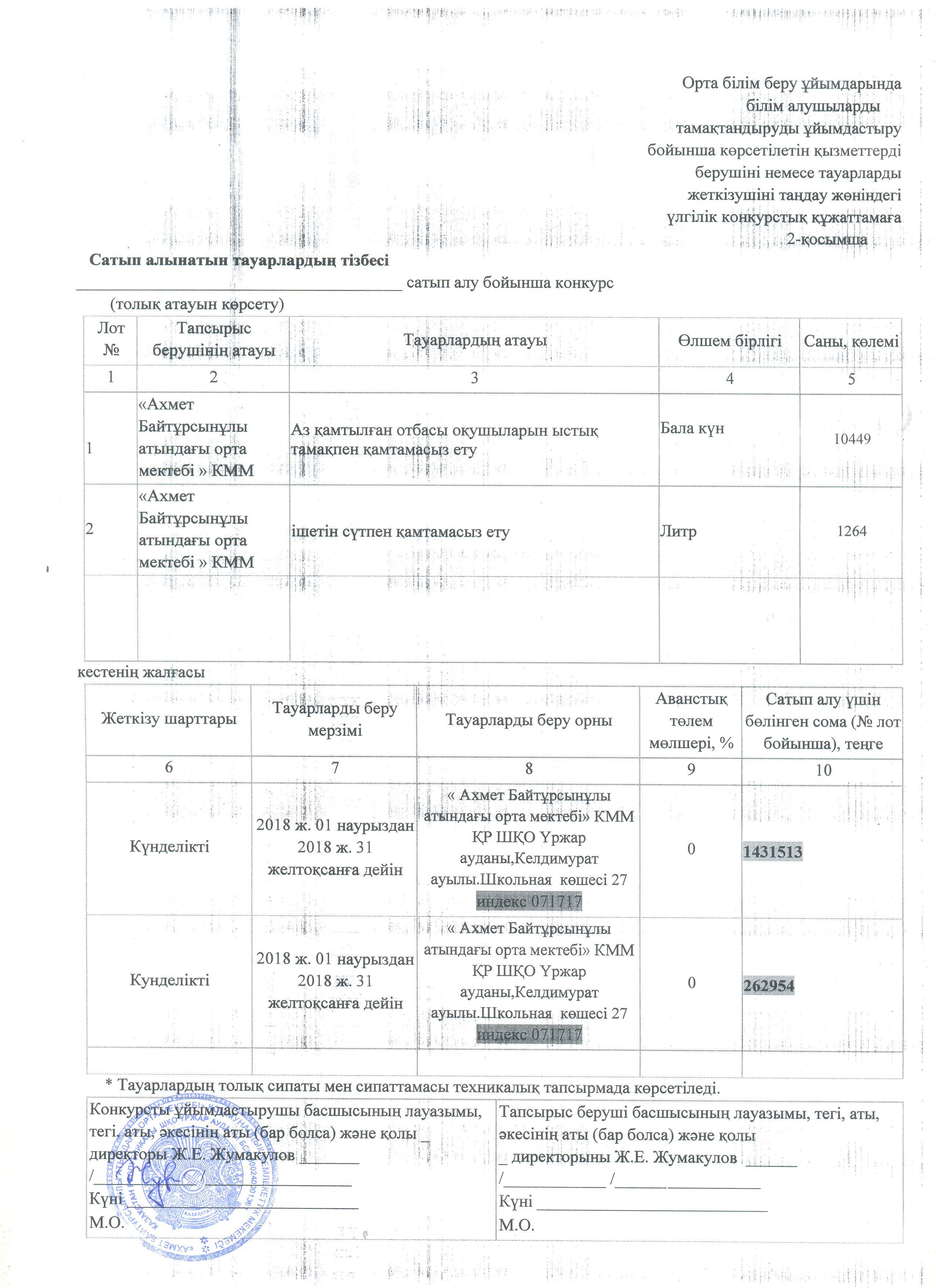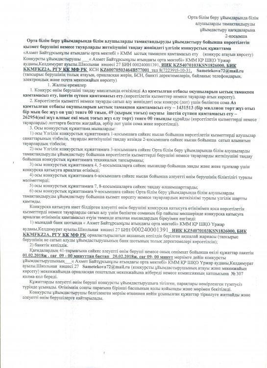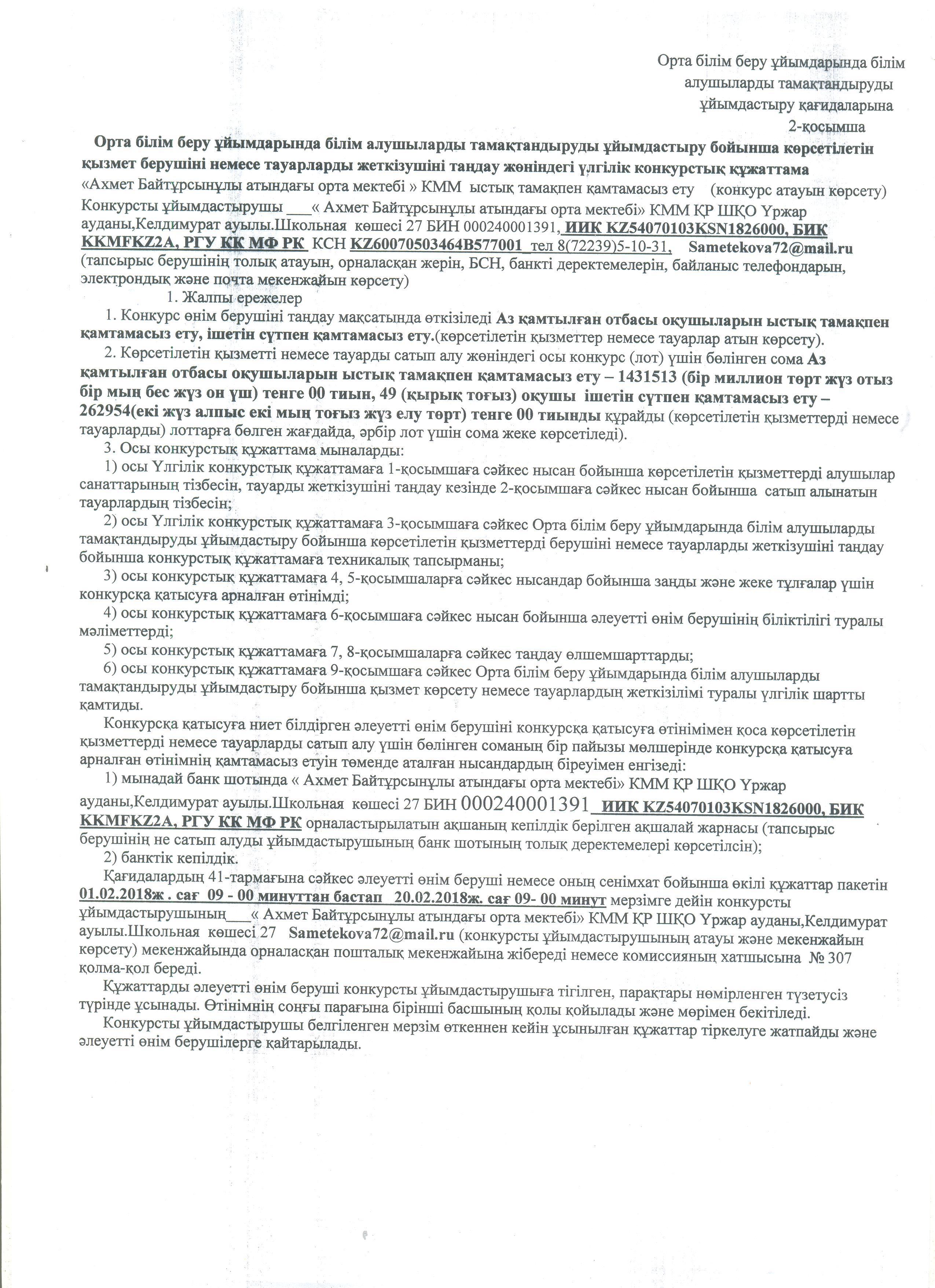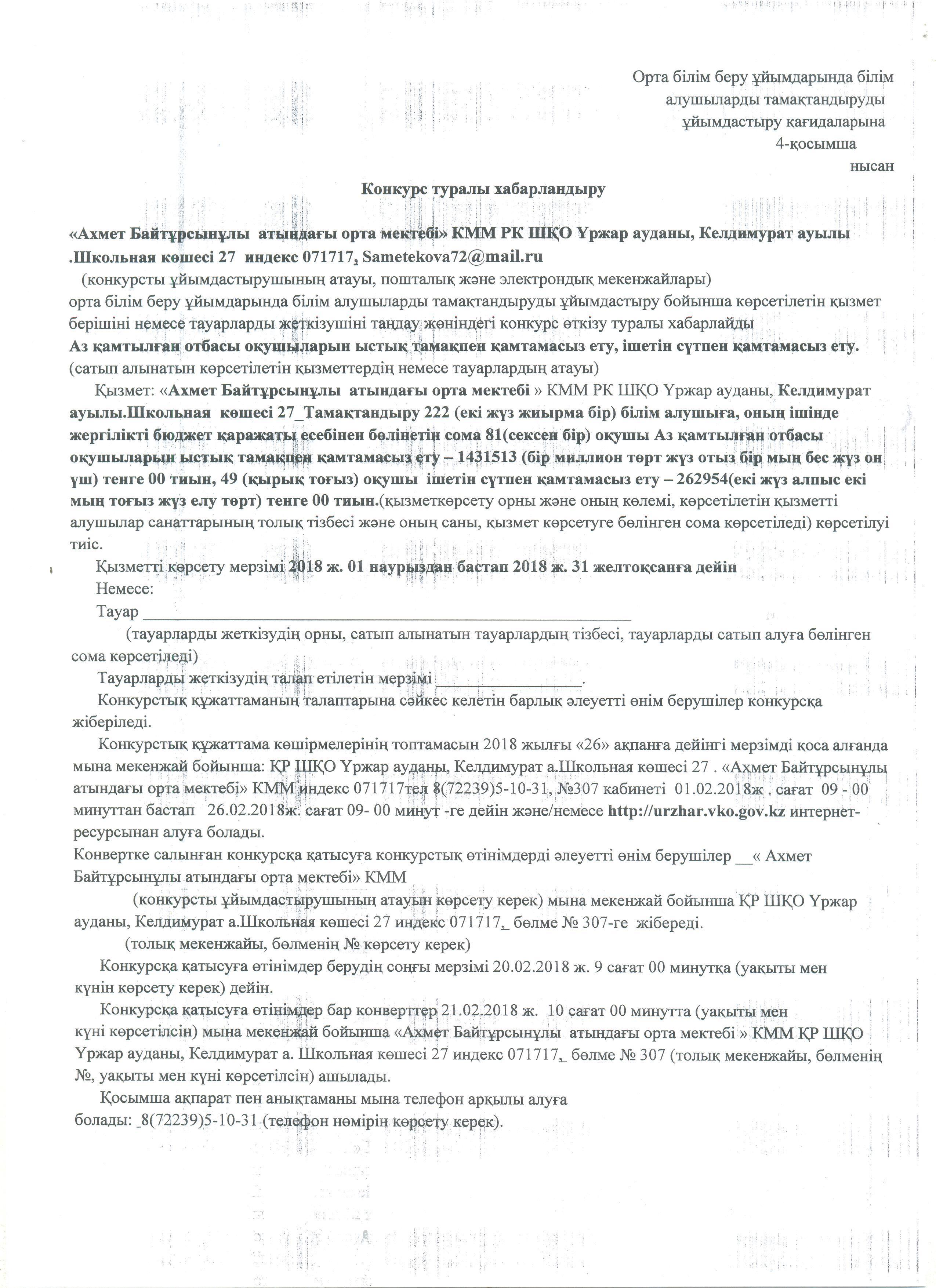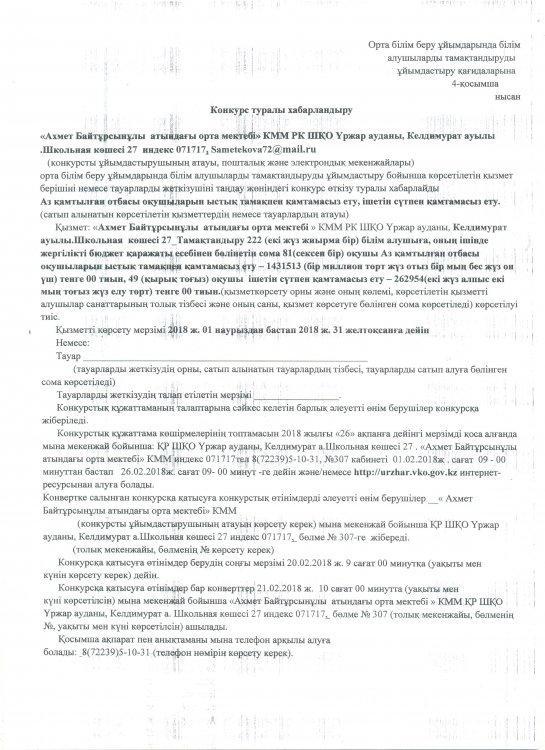 Ашық конкурс; "Ахмет Байтұрсынұлы атындағы орта мектебі" КММ-нің 2019 жылы жариялаған ыстық тамақ конкурсы http://blagodarnoe.mektebi.kz/pitanie/ashy-konkurs/47-ashy-konkurs-ahmet-bajtrsynly-atynday-orta-mekteb-kmm-n-2019-zhyly-zharijalaan-ysty-tama-konkursy.html http://blagodarnoe.mektebi.kz/pitanie/ashy-konkurs/47-ashy-konkurs-ahmet-bajtrsynly-atynday-orta-mekteb-kmm-n-2019-zhyly-zharijalaan-ysty-tama-konkursy.html