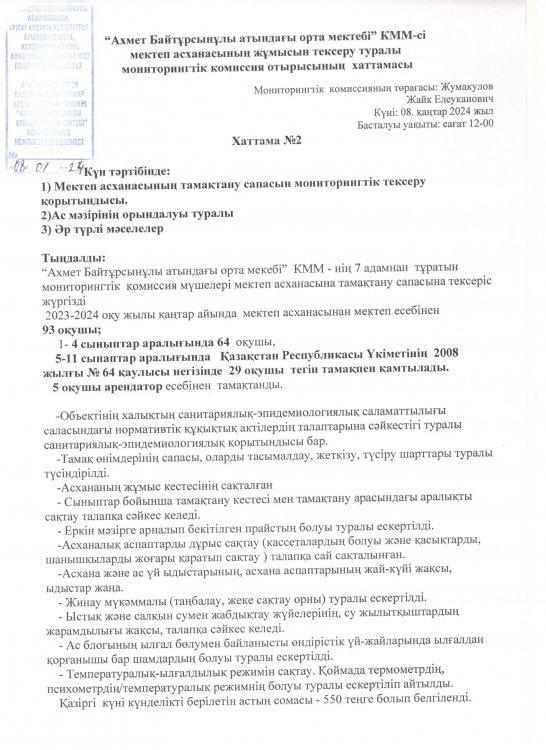 "Ахмет Байтұрсынұлы атындағы орта мектебі" КММ- сі 2023-2024 оқу жылы ІІ - жарты жылдыға бойынша мектеп асханасынан тамақтанатын оқушылар саны- 93 оқушы;